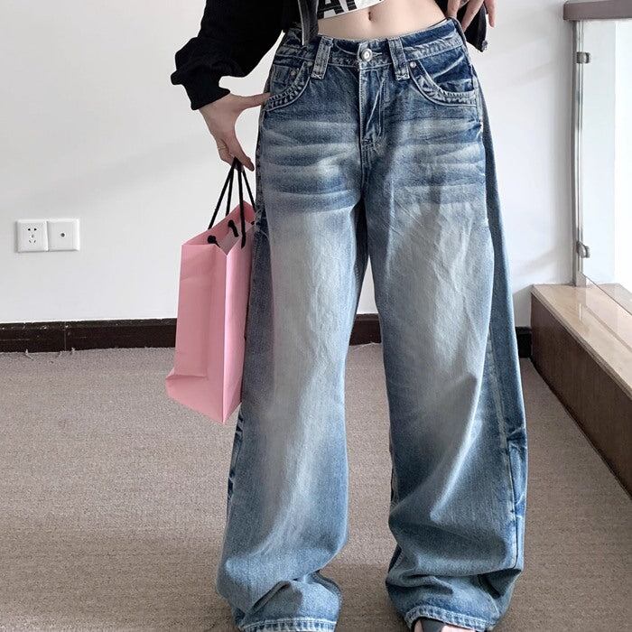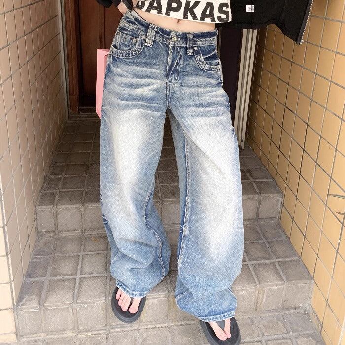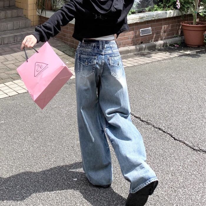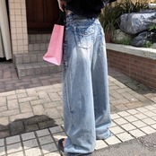 ヴィンテージ加工 デニムパンツ レディース 韓国 ファッション ダメージ ワイドデニムパンツ ジーンズ