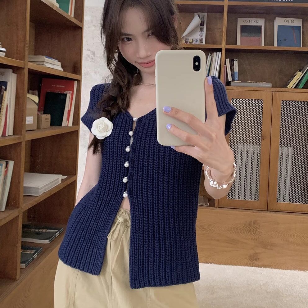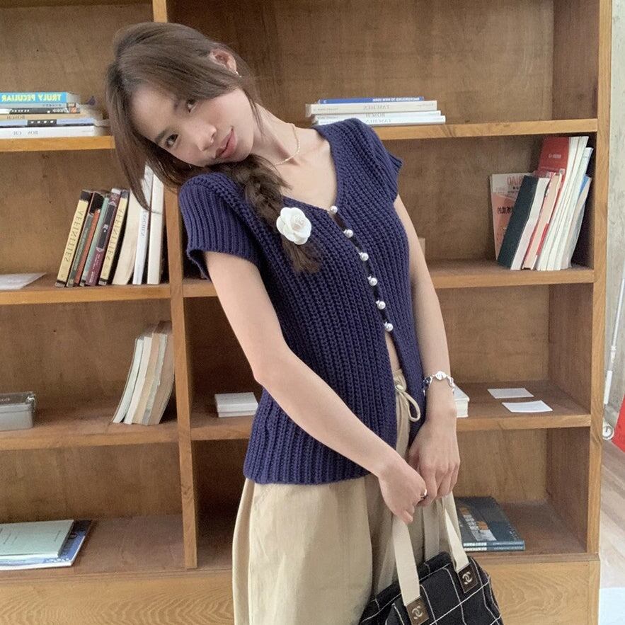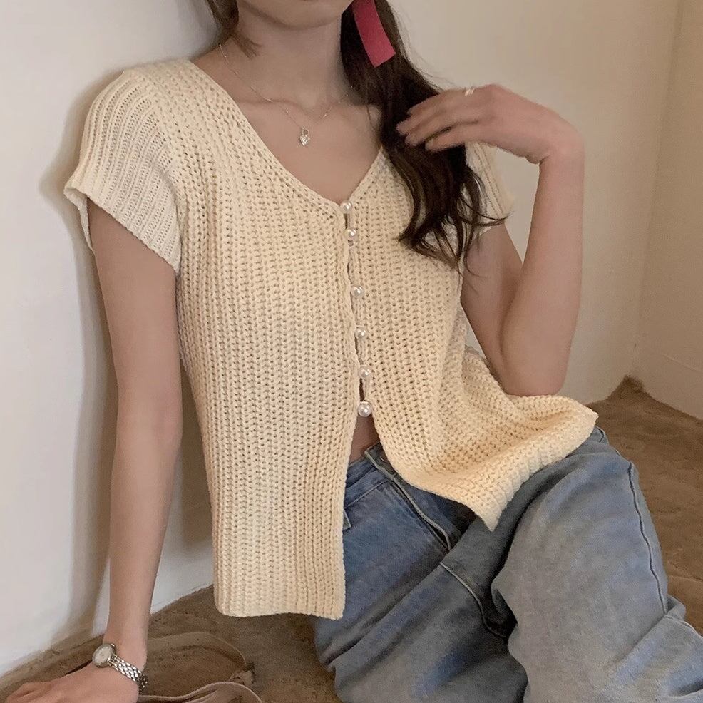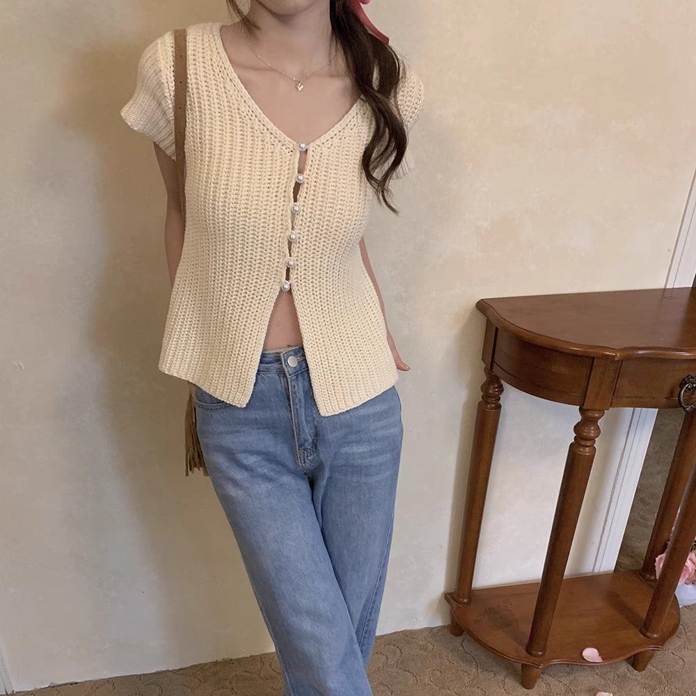 半袖 カーディガン レディース 夏 韓国 ファッション パールボタン サマー ニット ボレロ タイト ボタンニット