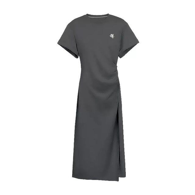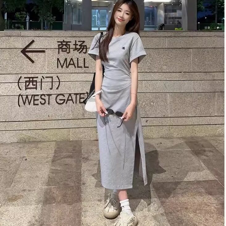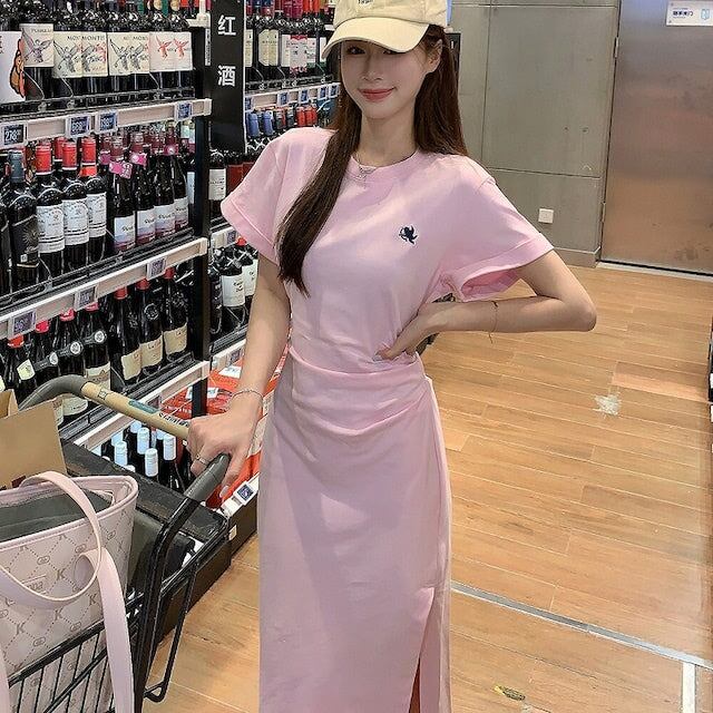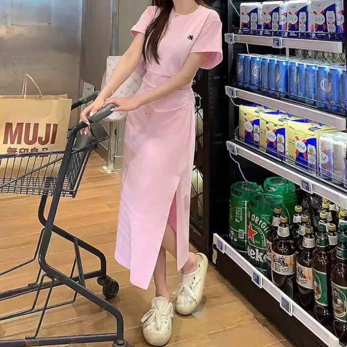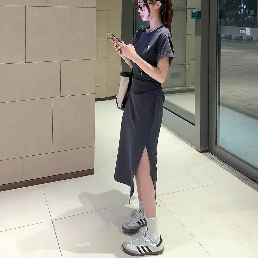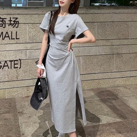 半袖 ロングワンピース レディース 韓国 ファッション 夏 カットソーワンピ スリット ウエスト絞り