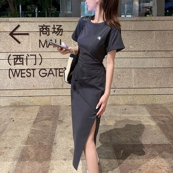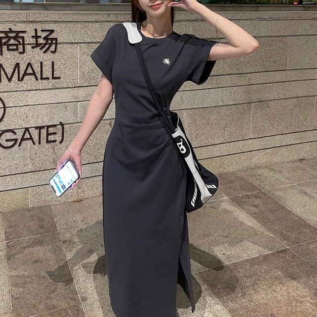ロングワンピース Tシャツワンピ レディース 韓国 ファッション 夏ワンピ スリット アシメ 大人 ウエストマーク