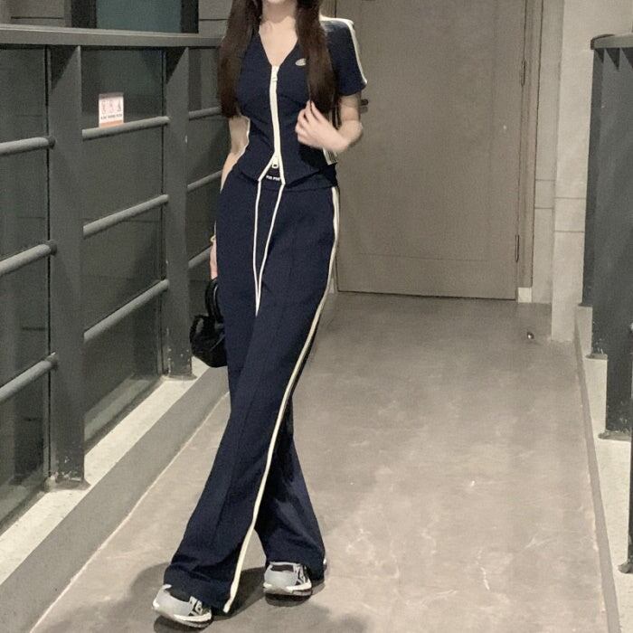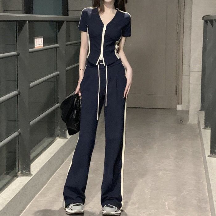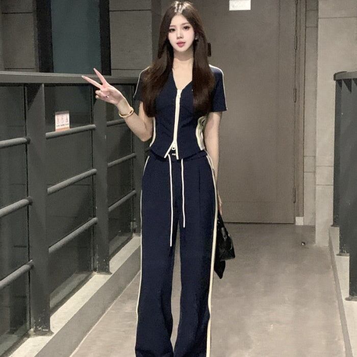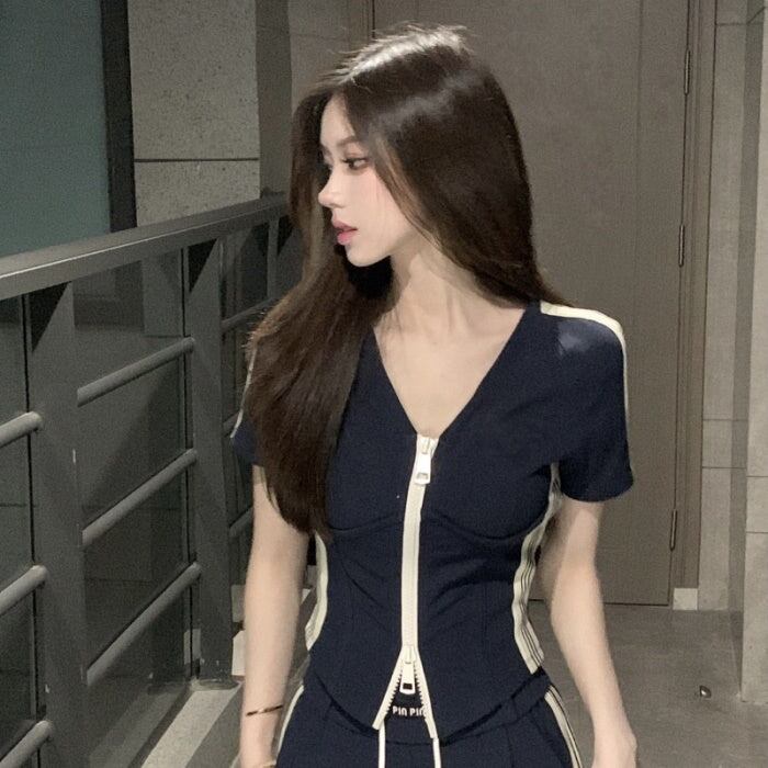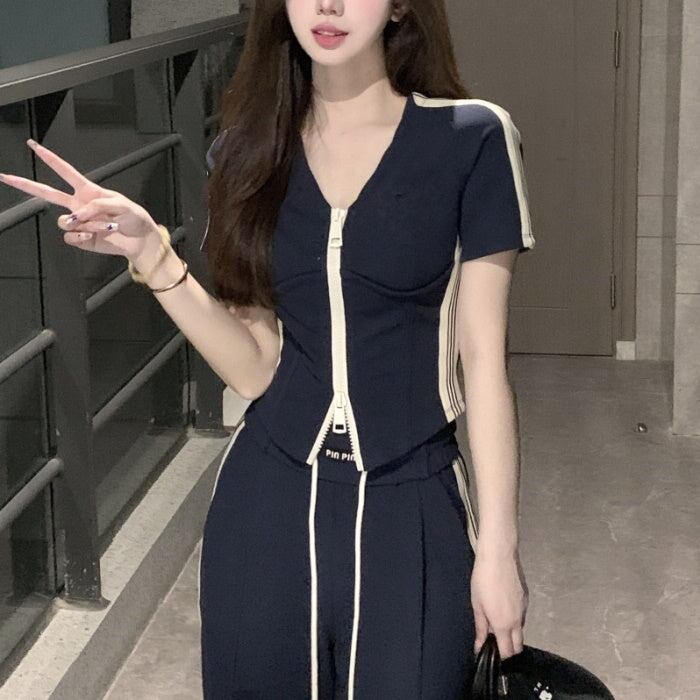 セットアップ レディース 韓国 ファッション ダブルジップ 半袖 タイトカーディガン ハイウエストサイドラインパンツ 夏 スポーツ タイト ヨガ フィットネス ストリート