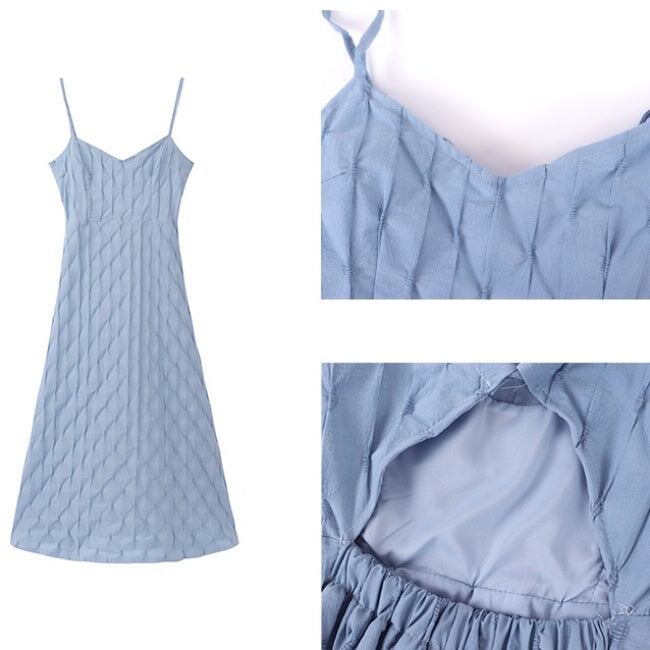 ワンピース バックカット レディース 韓国 ファッション 背中見せワンピ サマードレス キャミワンピ リボン ジャガード チェック柄 ダイヤ柄 おしゃれ ブルー