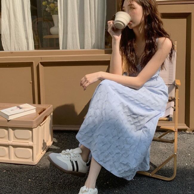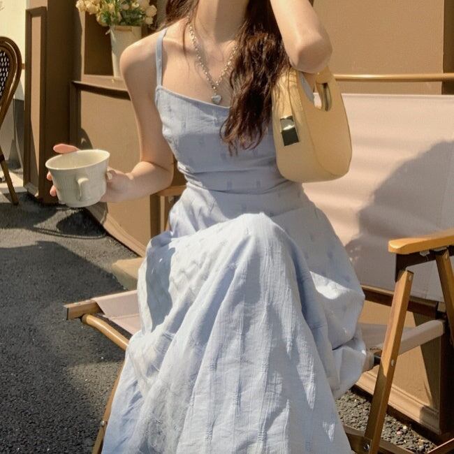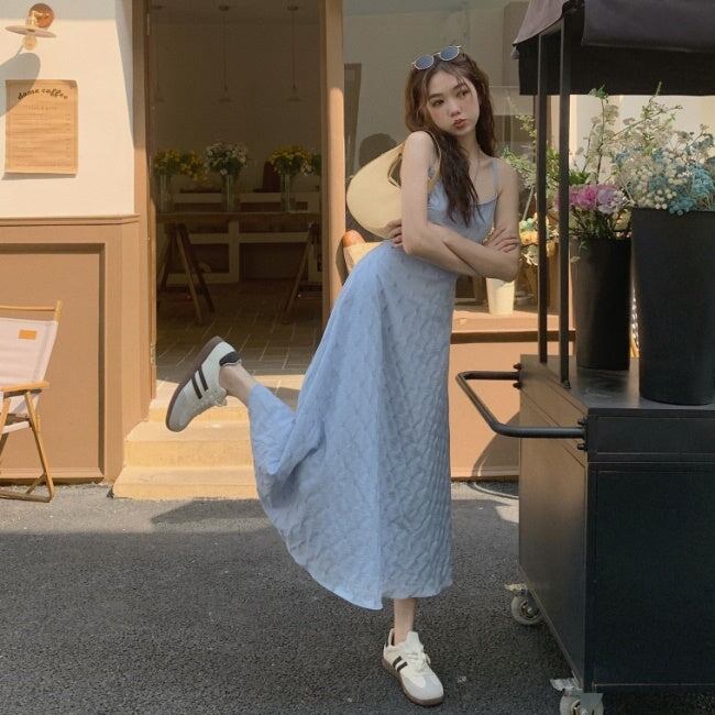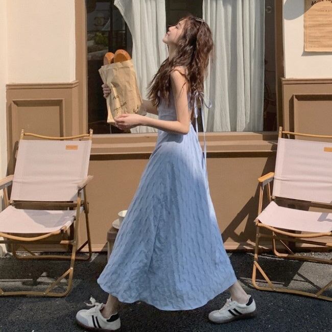 夏 キャミ ワンピース レディース 韓国 ファッション 夏 背中見せ ノースリーブ サマー ロングワンピース ブルー