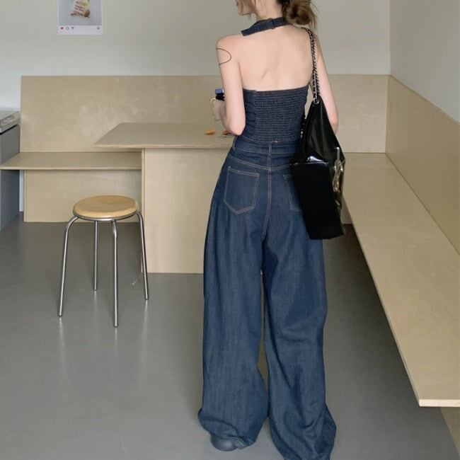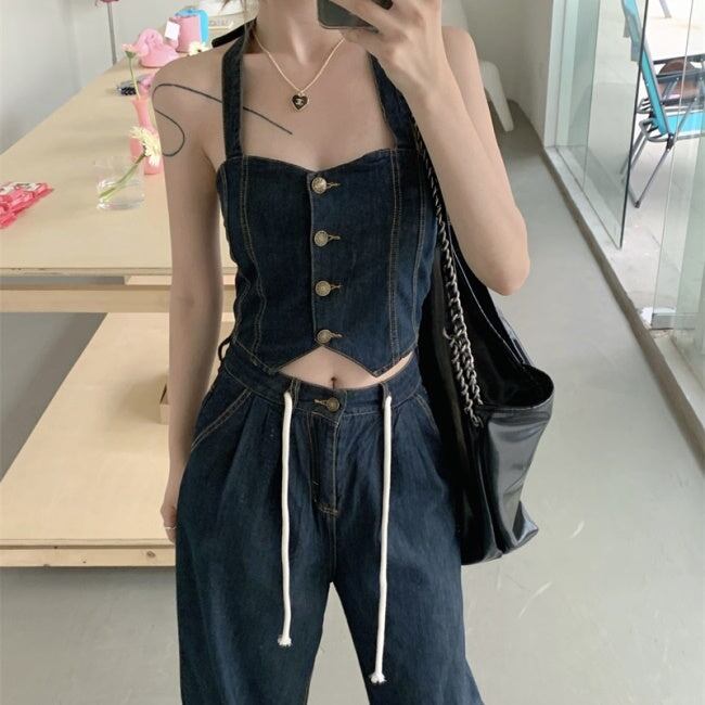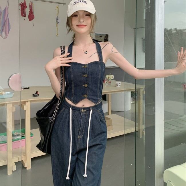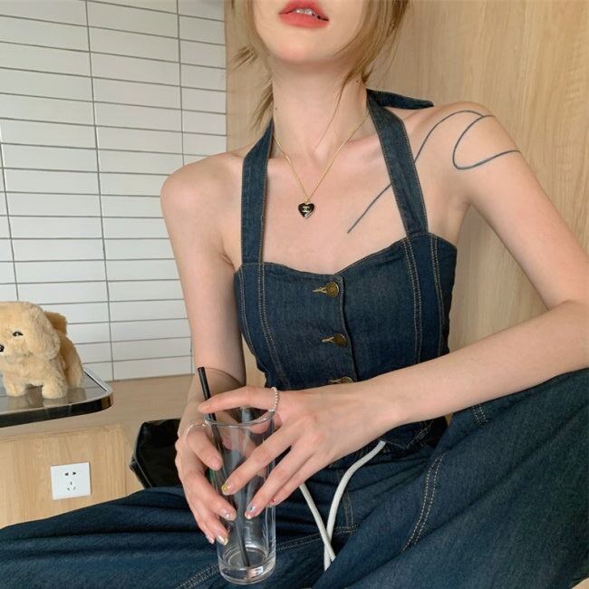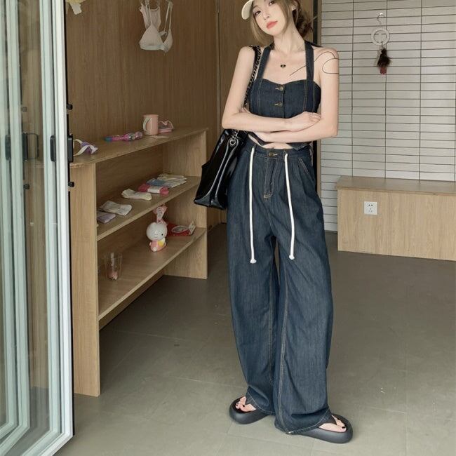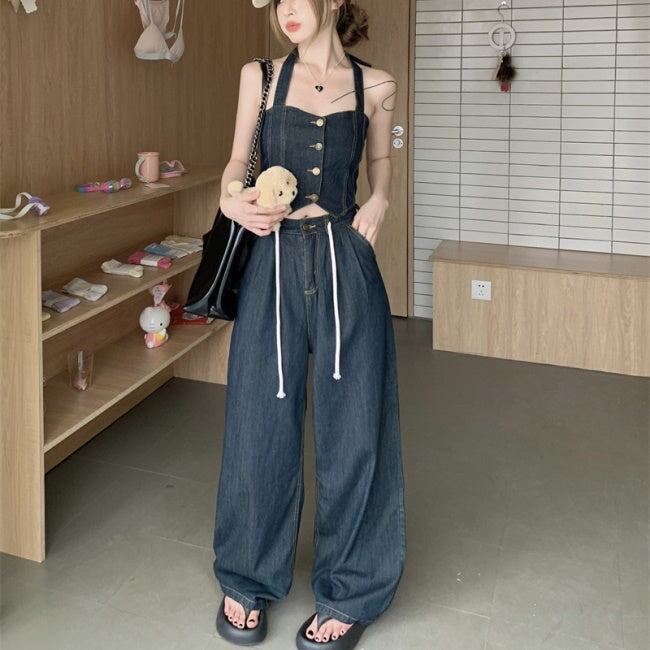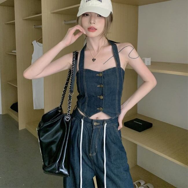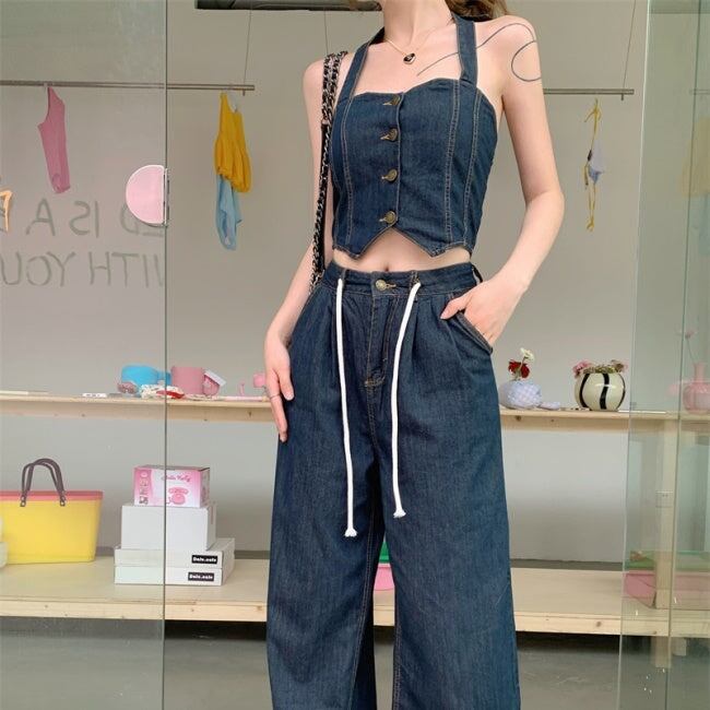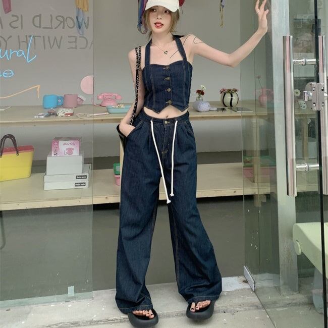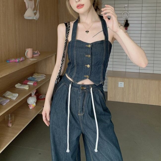 デニムオンデニム セットアップ レディース 韓国 ファッション ワイドパンツ ノースリーブ クロップトップ ブルーデニム ホルターネック