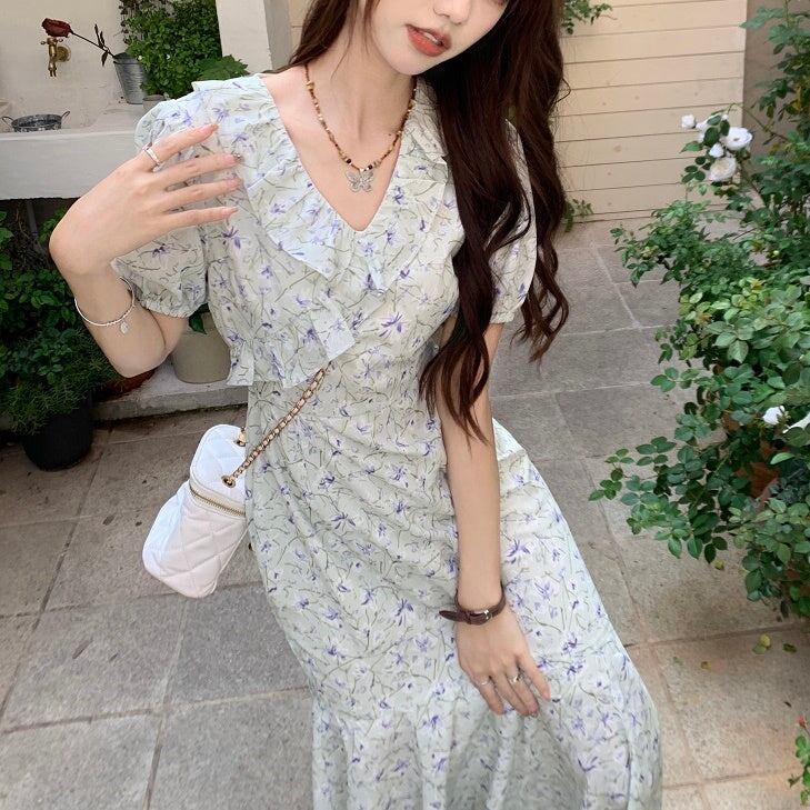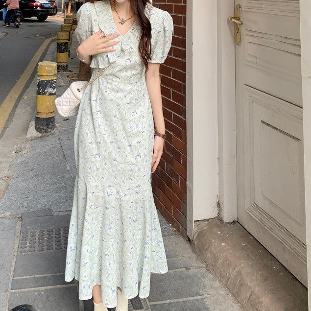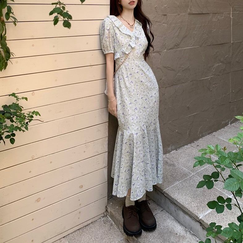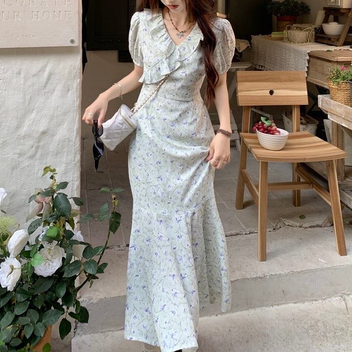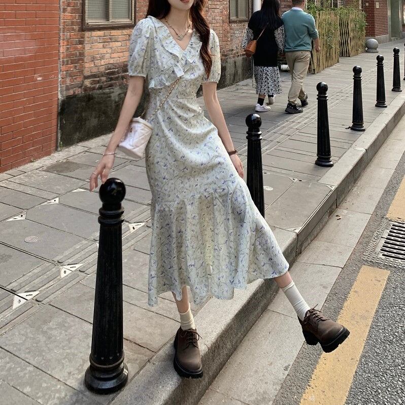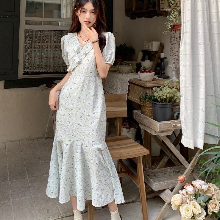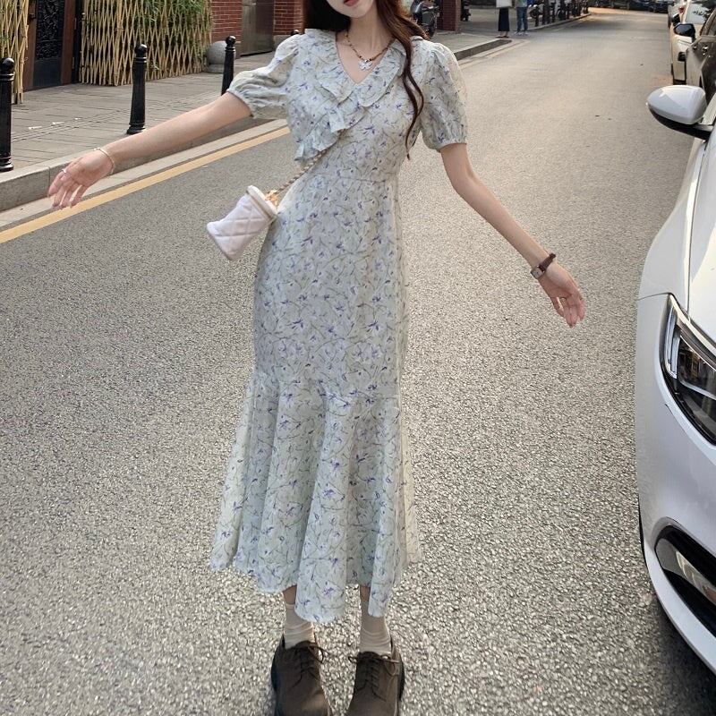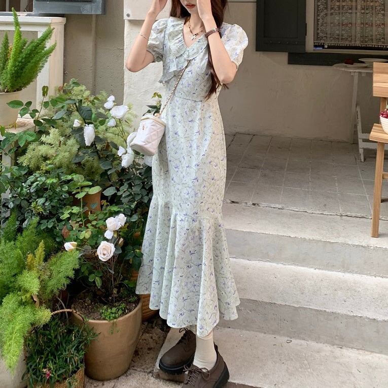 夏ワンピース マーメイド フリル 花柄 レディース 韓国 ファッション フェミニン 上品 お呼ばれワンピ アシメ ラッフル 切り替え ロング ギャザー フレア 体系カバー