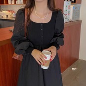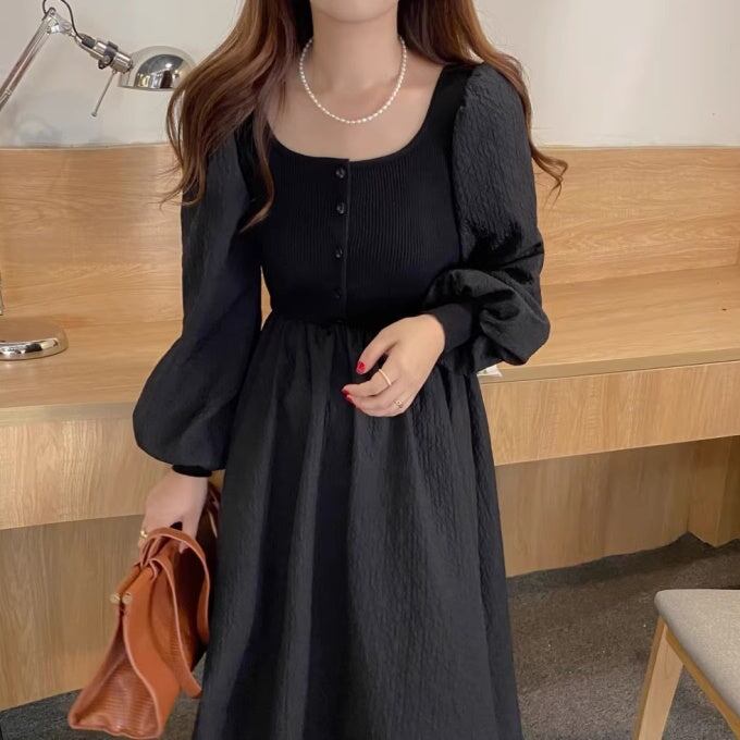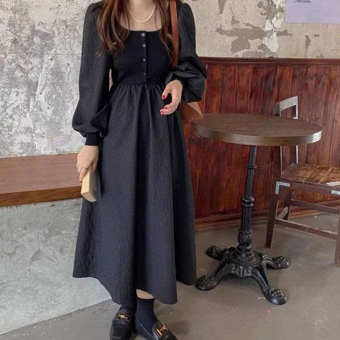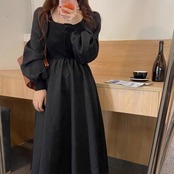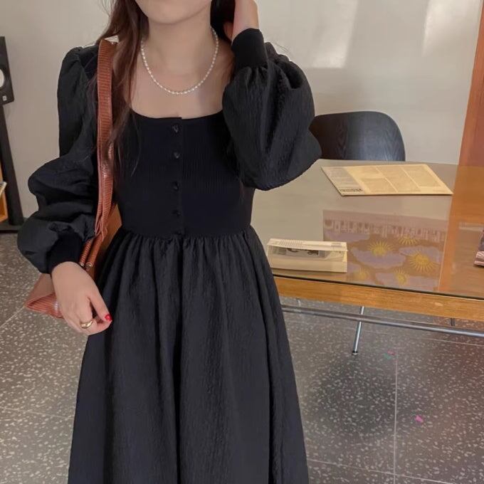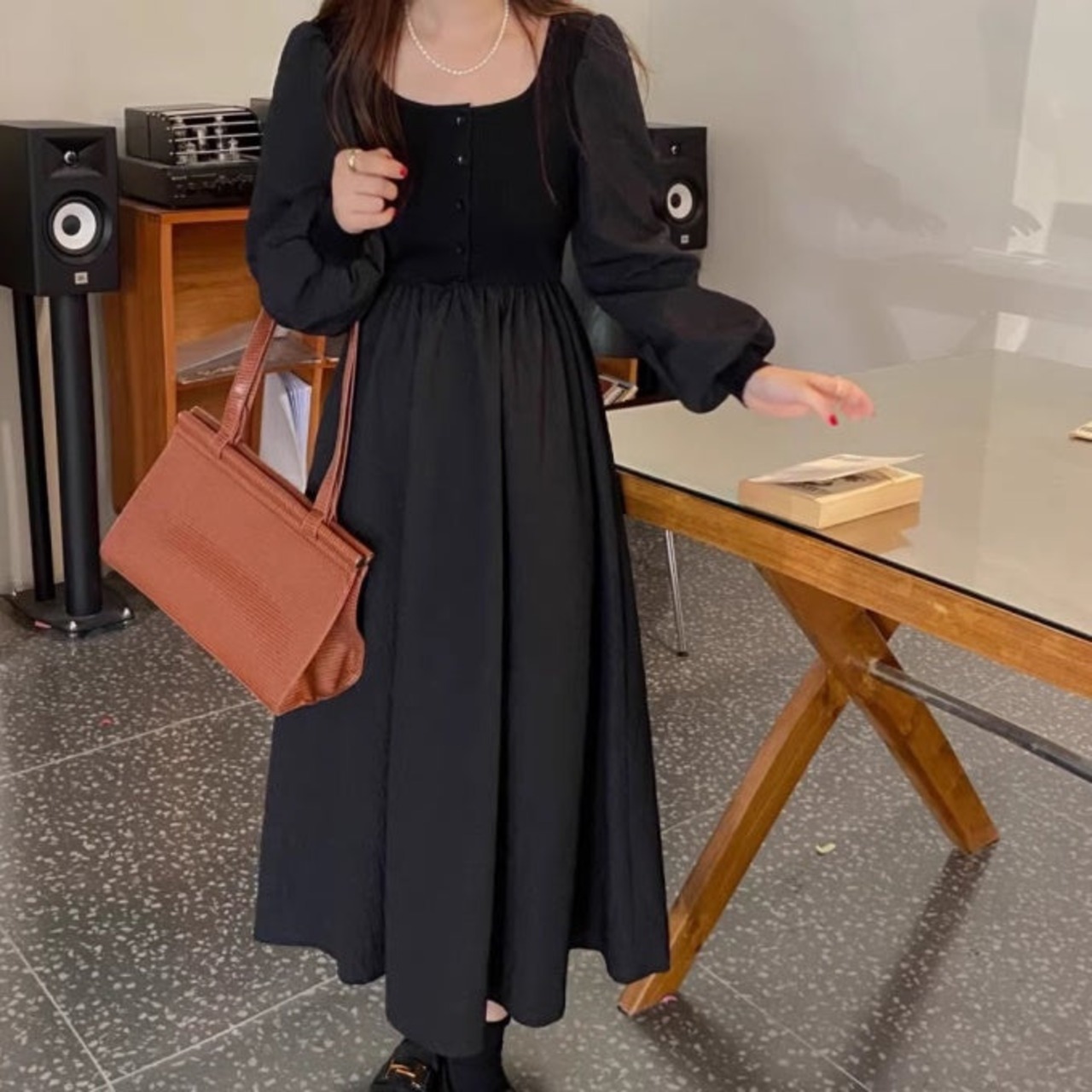 秋冬 ロングワンピース 韓国 ファッション お呼ばれ 異素材 ドッキング 黒ワンピ フレア ワンピ