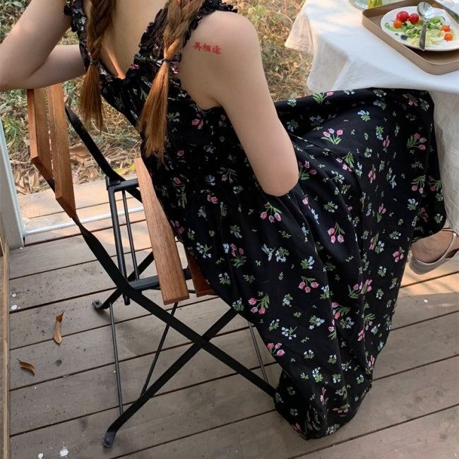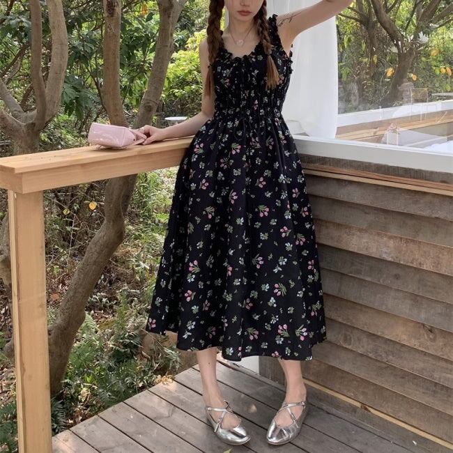 花柄 黒ワンピース レディース 韓国 ファッション Aライン ロングフレア プリント 柄ワンピース フリル リボン ノースリーブ ロングワンピ 夏ワンピ