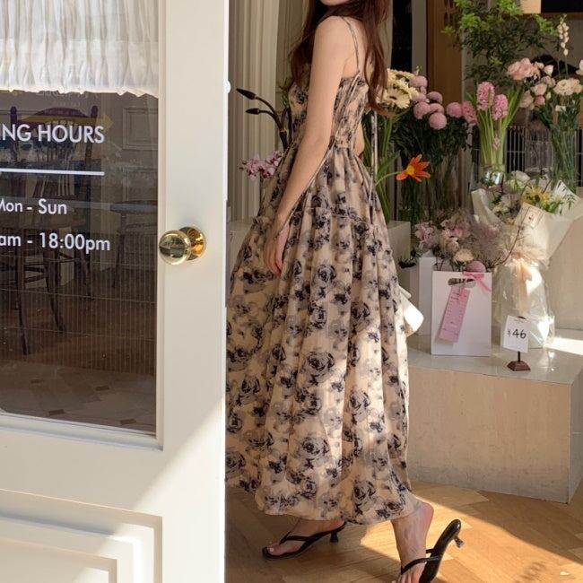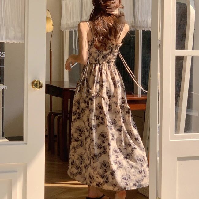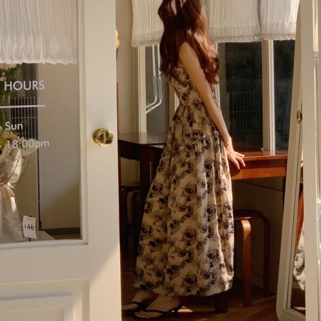 花柄 ワンピース レディース 韓国 ファッション エアリー Aライン フレア ロング ノースリーブ ホルターネック リボン シャーリング チューブ サマードレス 夏ワンピース