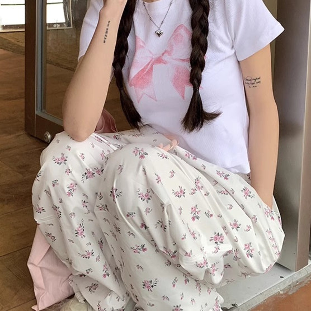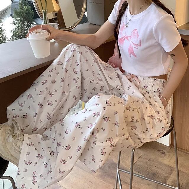 パンツ レディース 韓国 ファッション 柄パンツ 花柄 白パンツ ガーリー ワイドパンツ かわいい おしゃれ カジュアル ピンクリボン