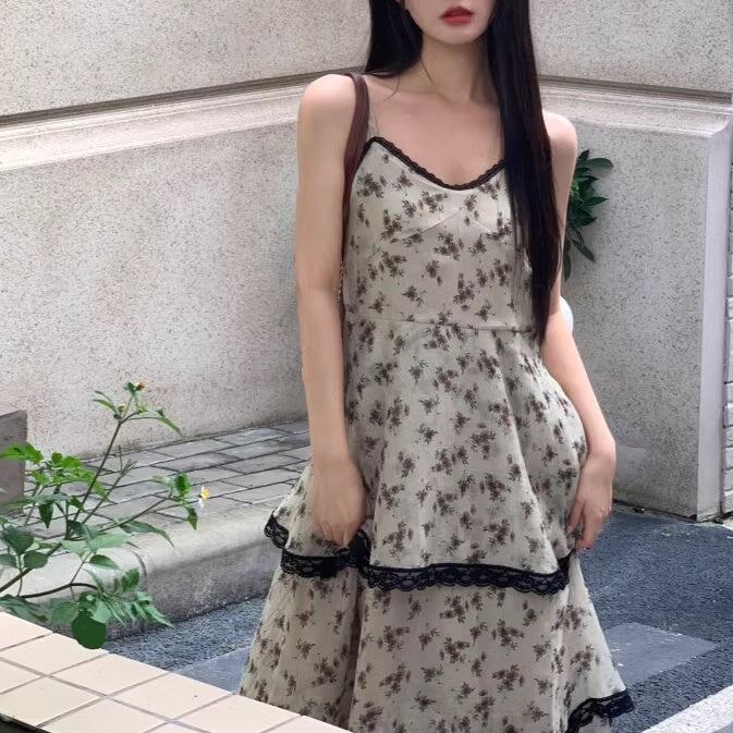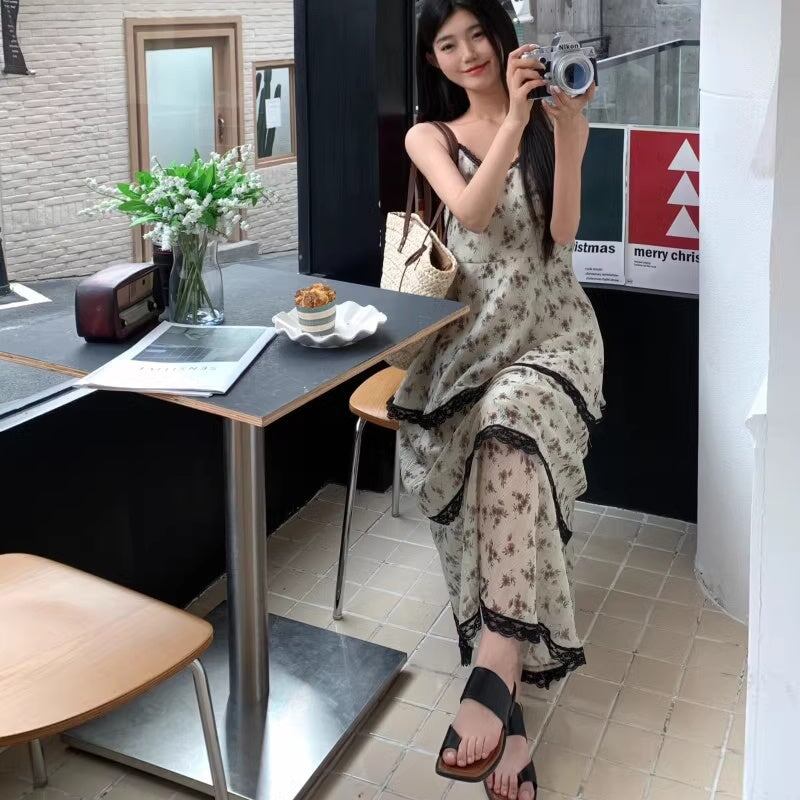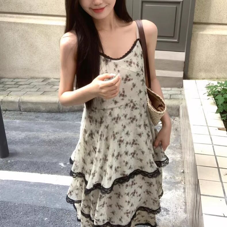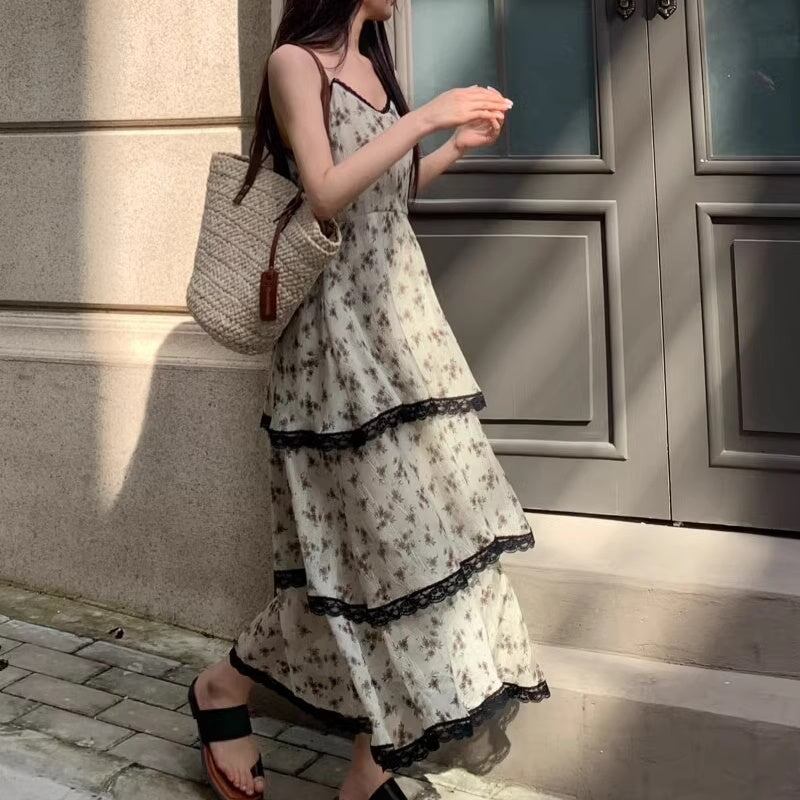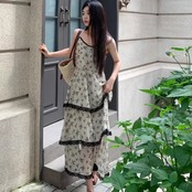 ワンピース 花柄 レディース 韓国 ファッション キャミワンピ ロング ティアード 異素材ミックス レース ノースリーブ ガーリー