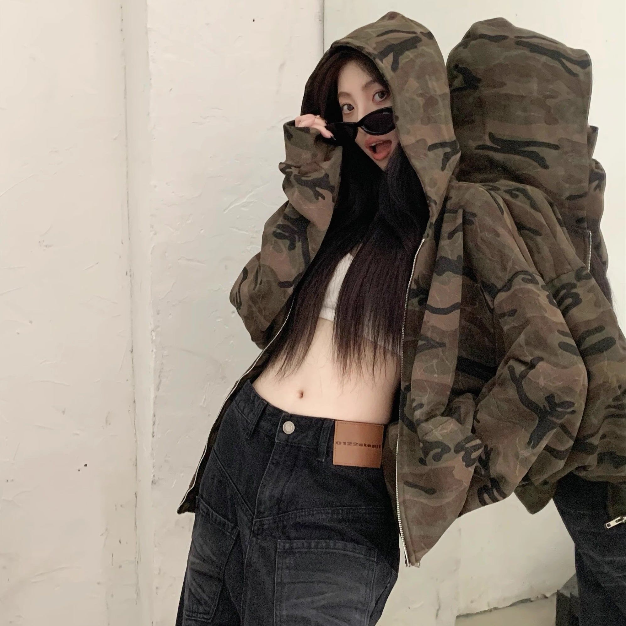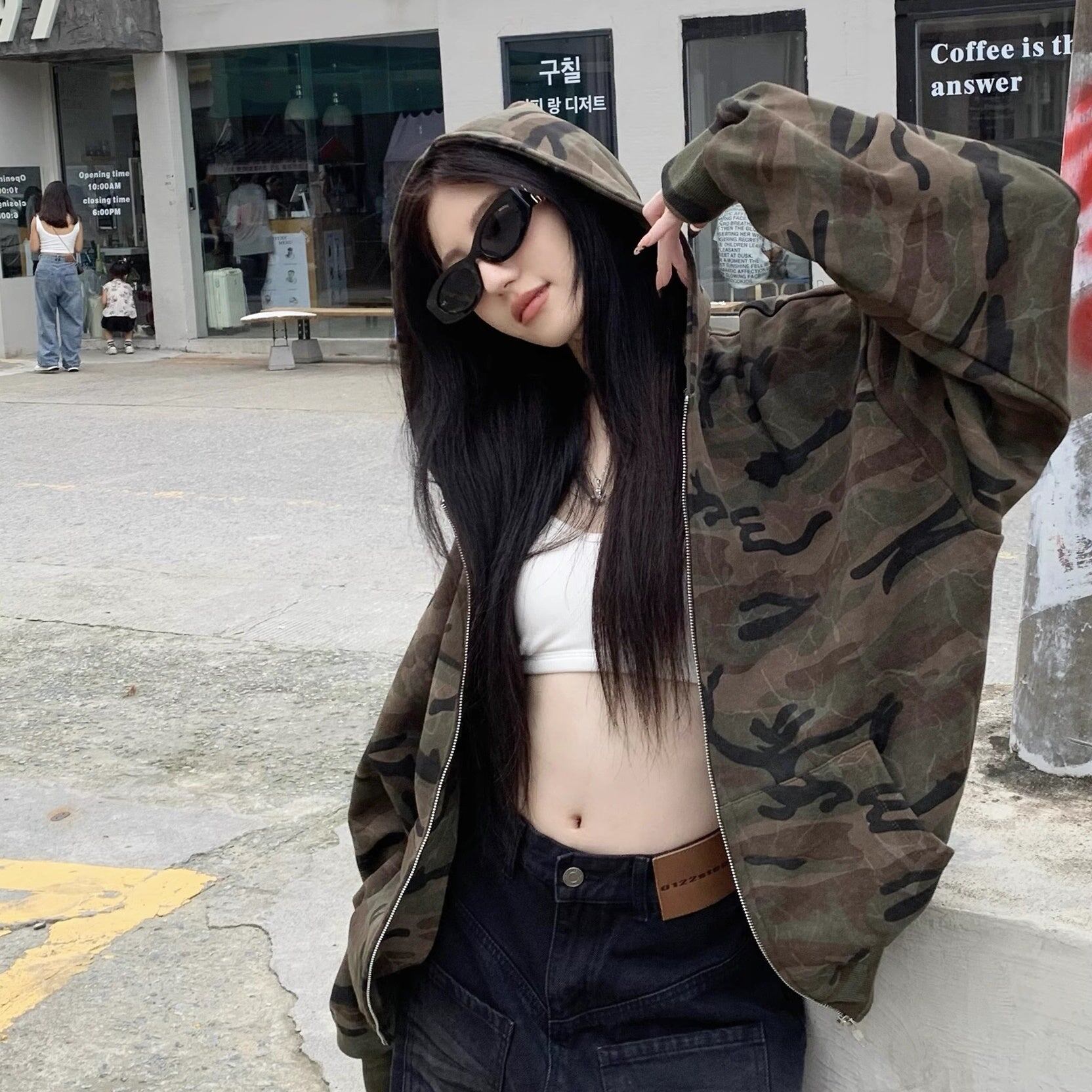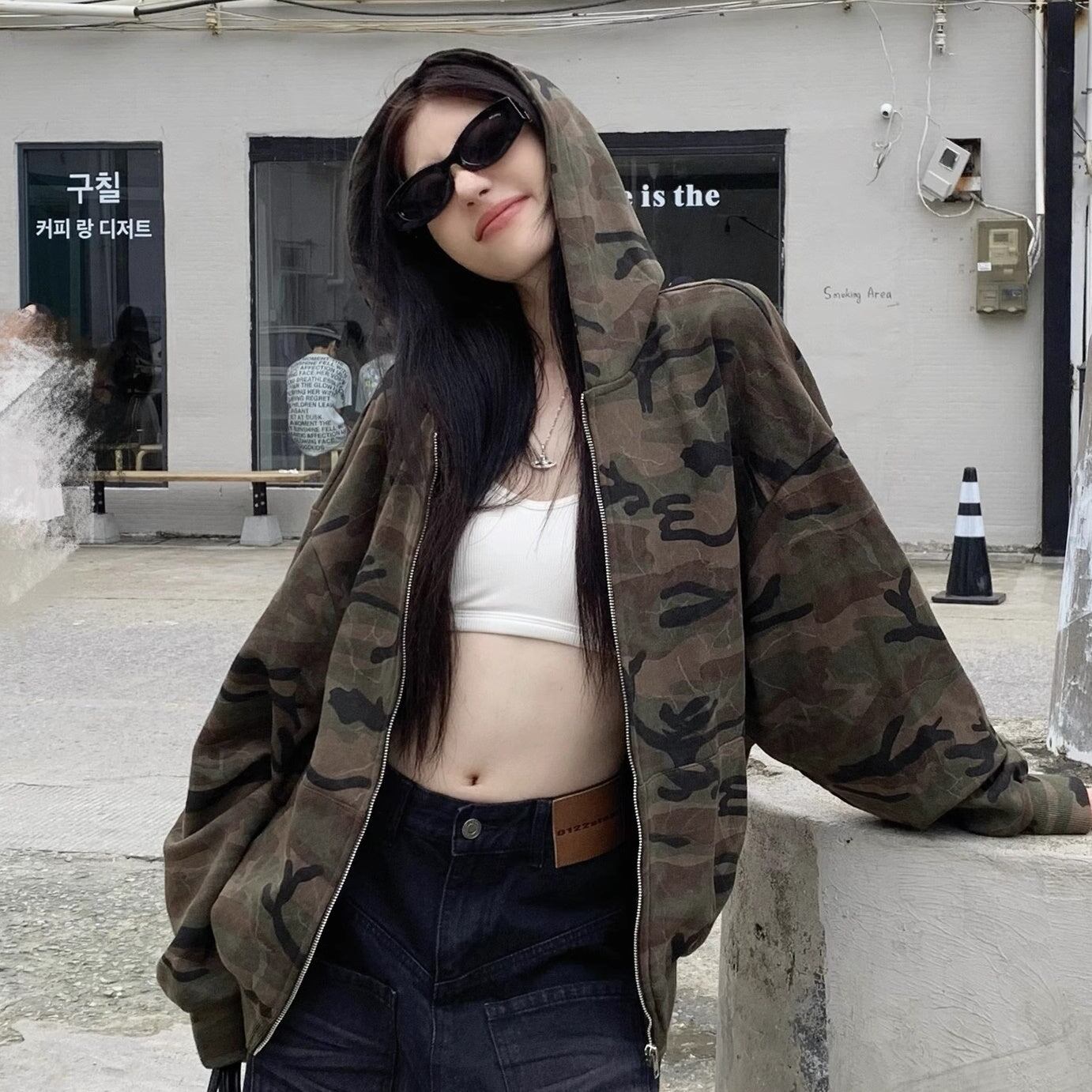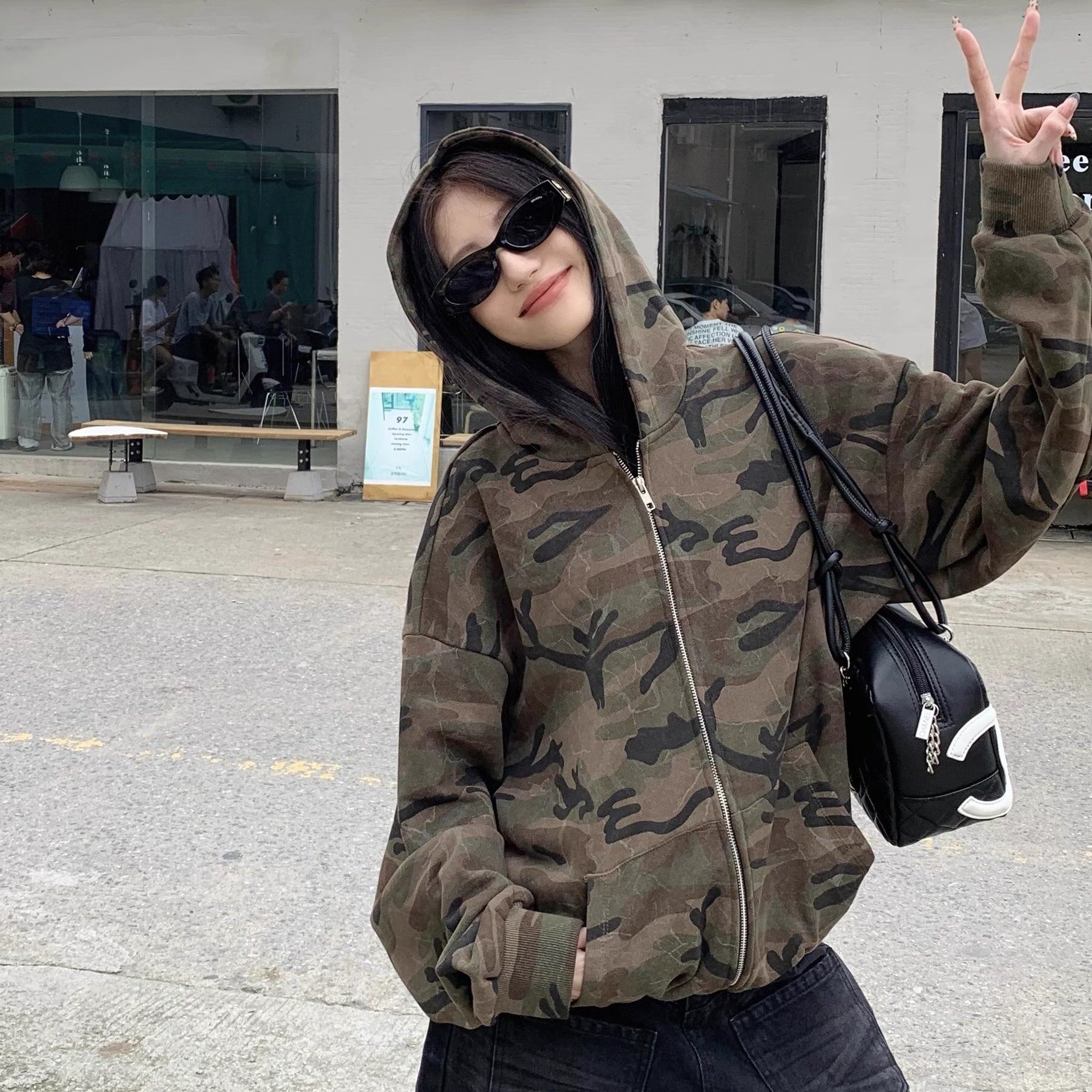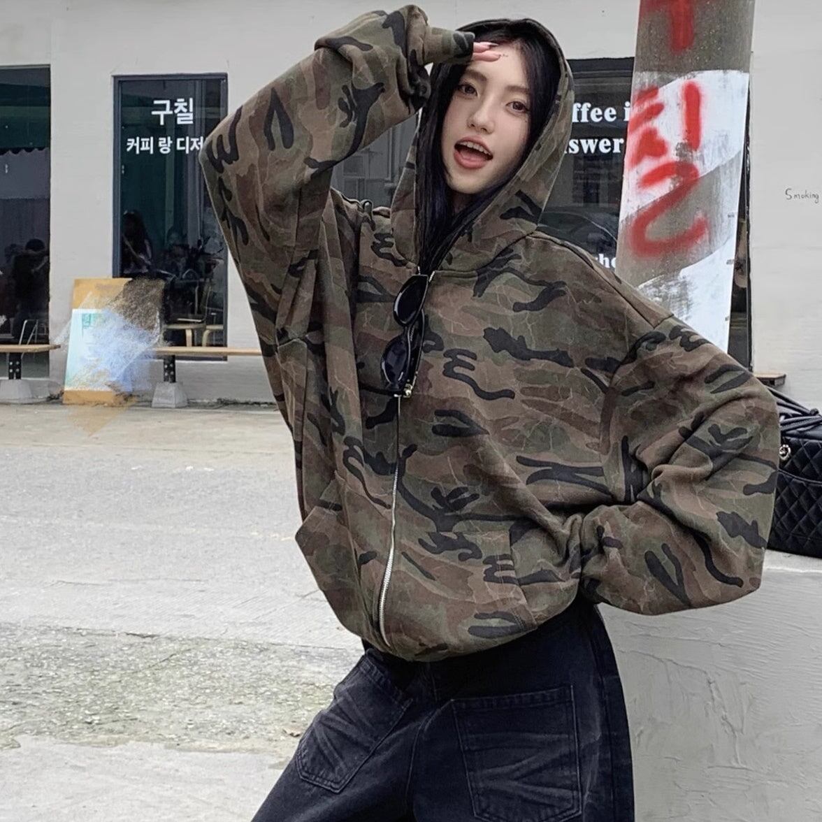 迷彩 ジップ パーカー レディース 韓国 ファッション カモフラ ジップアップ オーバーサイズ フスウェット ーディー