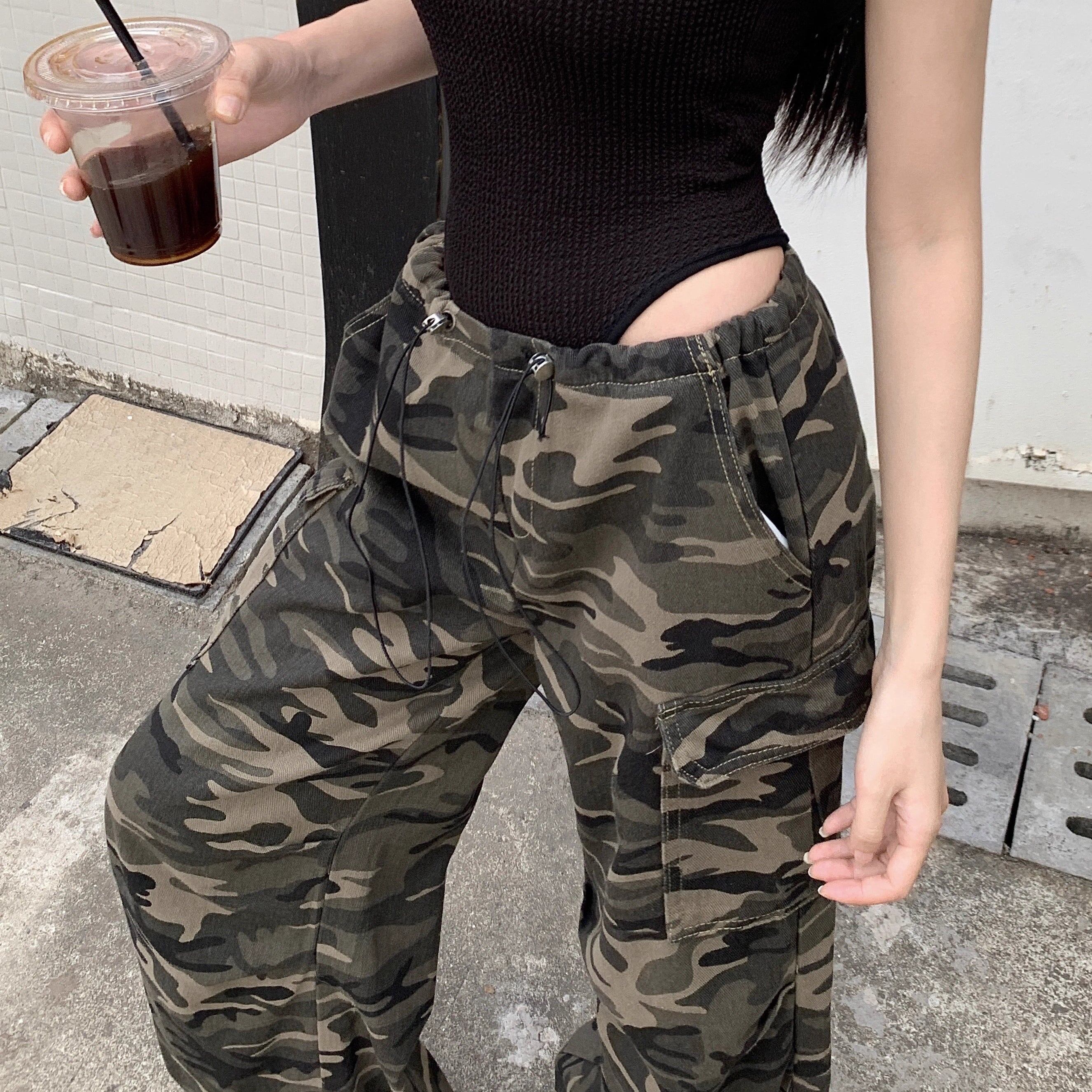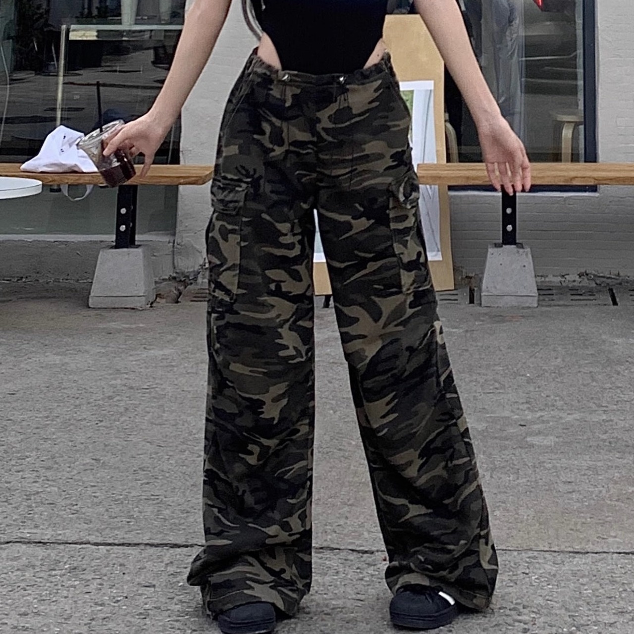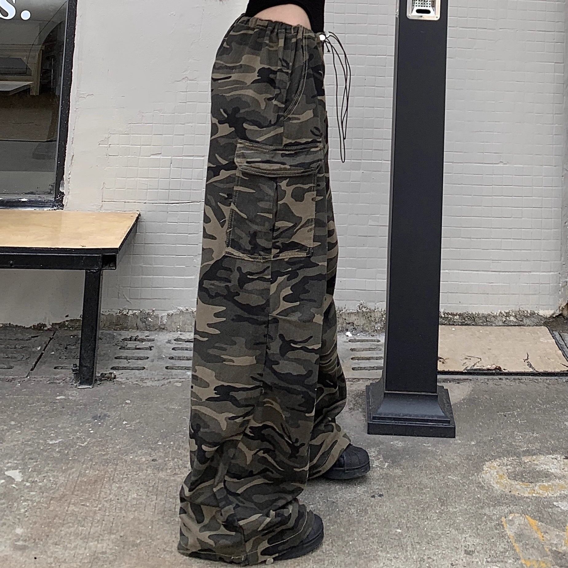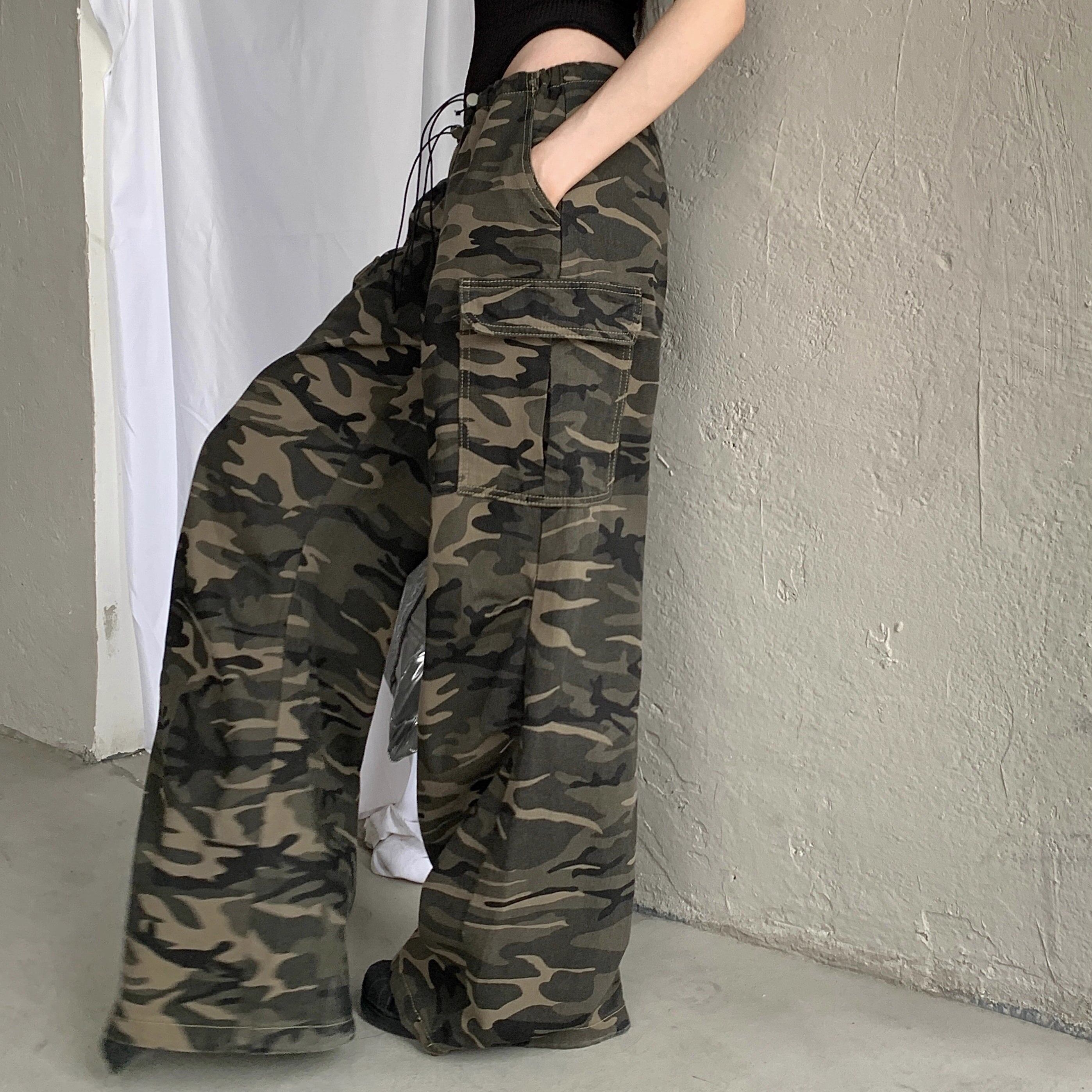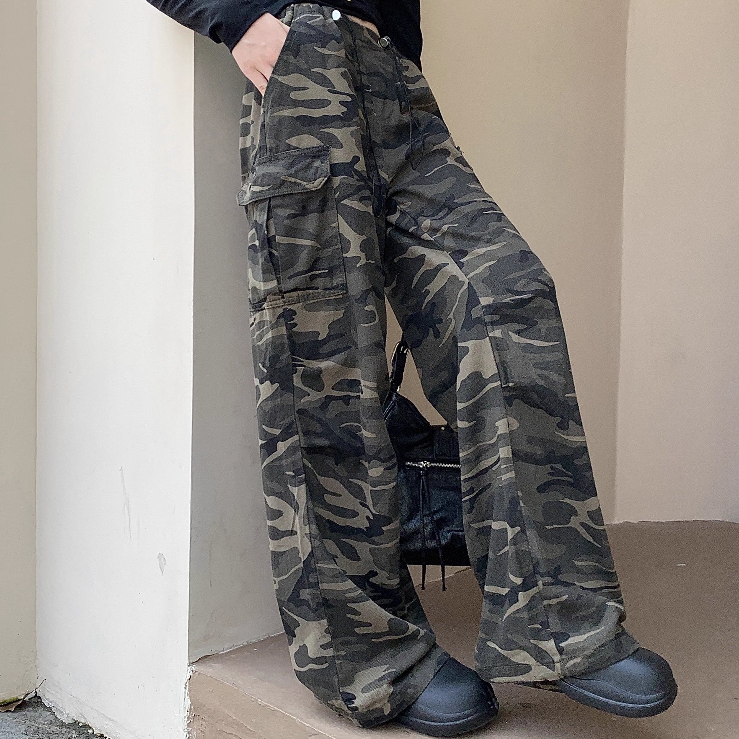 柄パンツ 迷彩カーゴパンツ レディース 韓国 ファッション アメカジ ロング ハイウエスト サイドポケット カーキ カモフラージュ