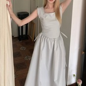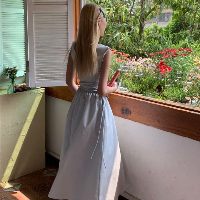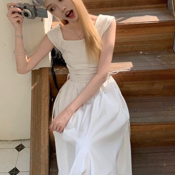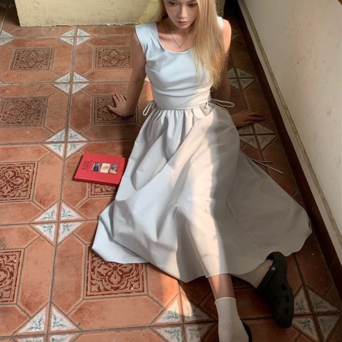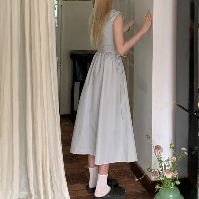 韓国 ワンピース ノースリーブ フレア ロングワンピ 夏 ウエストシェイプ ウエストシャーリング シンプル ワンピース
