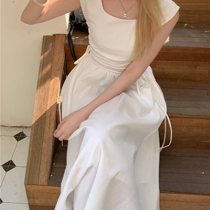 白 ワンピース レディース 韓国 ファッション ウエストシェイプ ハイウエスト ロング フレア Aライン おしゃれ ウエストギャザー 無地 お呼ばれ ロングワンピース