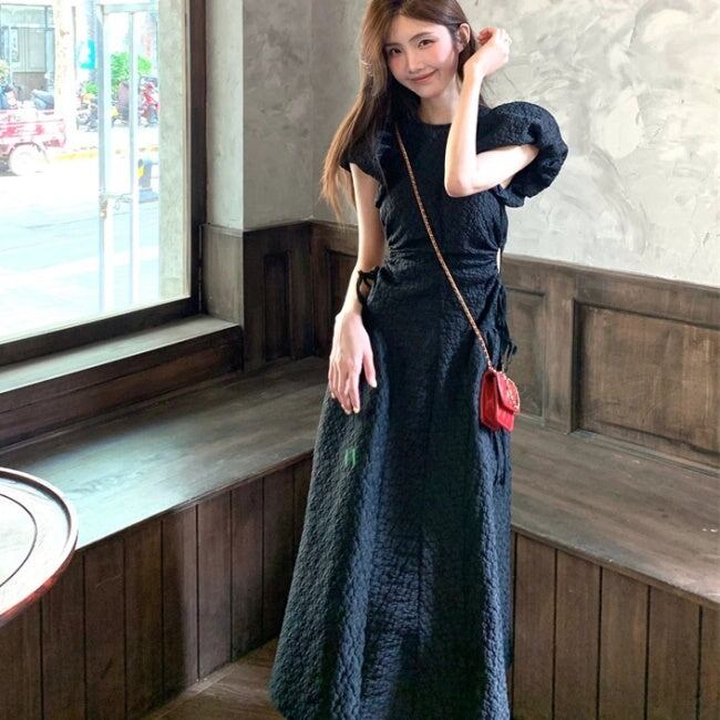 黒ワンピース. 韓国 サマーワンピ レディース 夏コーデ ロングワンピース パフショルダー サイドカット