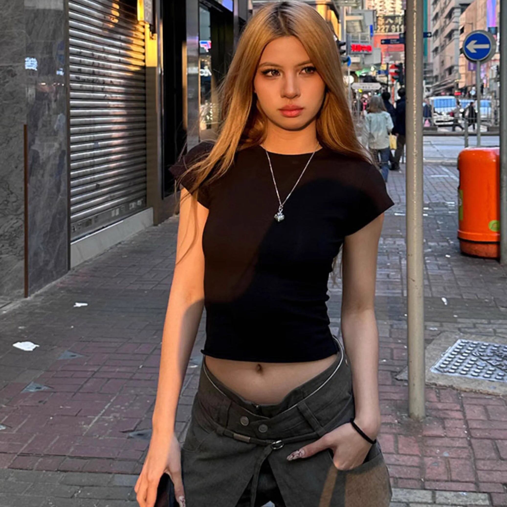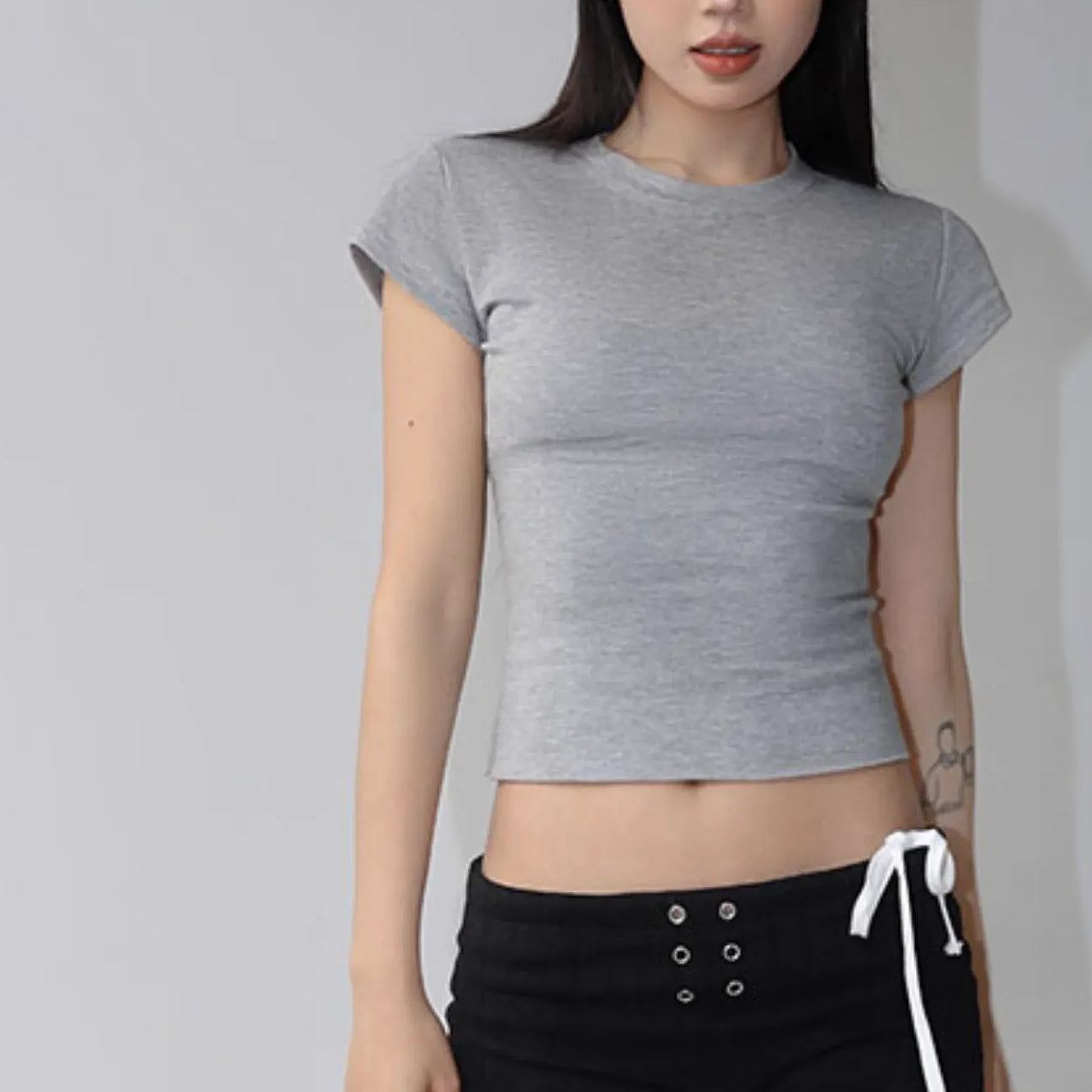 Tシャツ タイトストレッチ レディース 韓国 ファッション 無地 シンプル クロップドT フレンチT ショートT