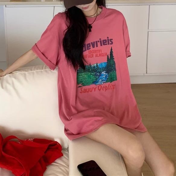 Tシャツ レディース 韓国 ファッション 半袖 夏トップス プリント カラー 柄 メンズライク mountain