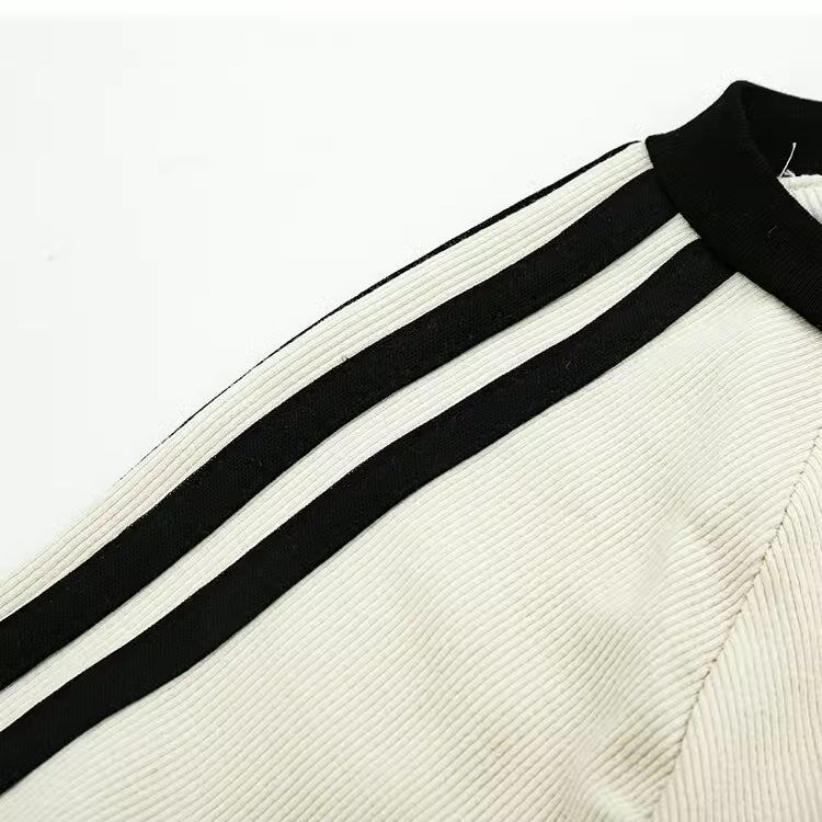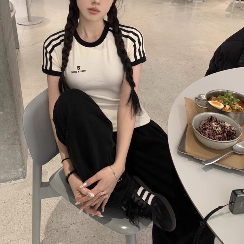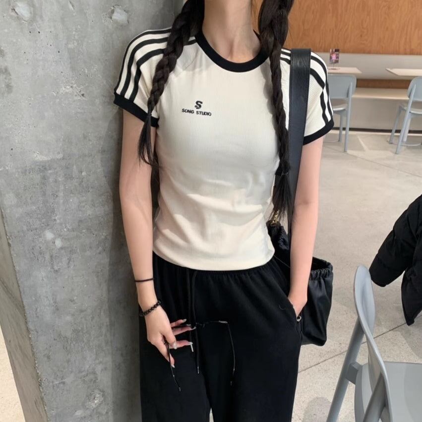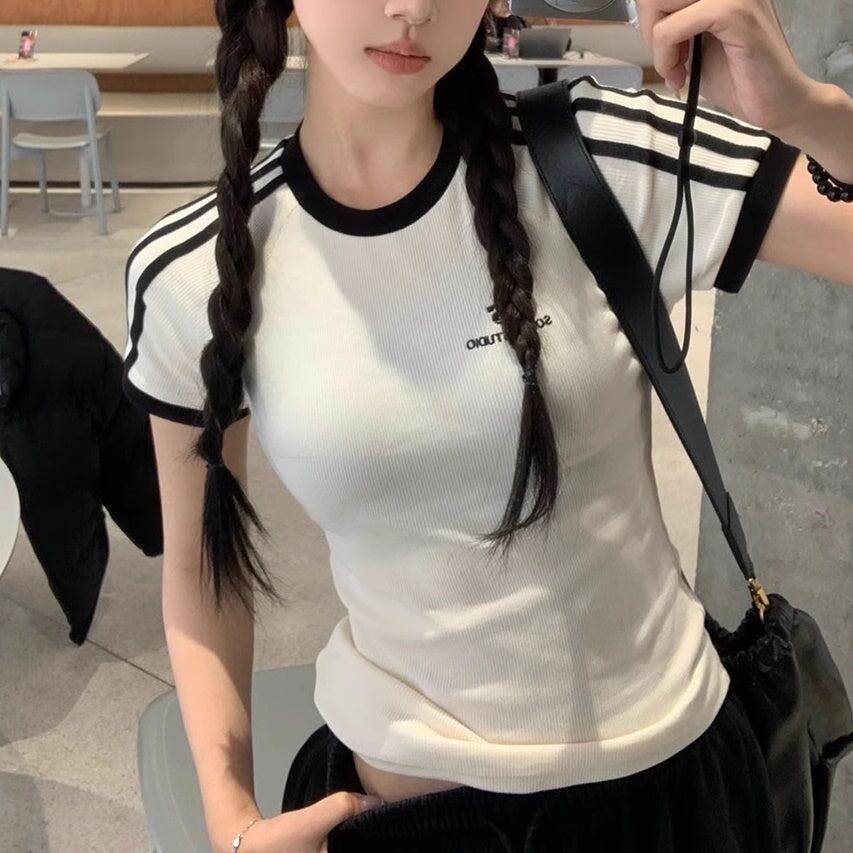 Tシャツ レディース ライン ストレッチ リブ チビT 韓国 ファッション リンガー ロゴT