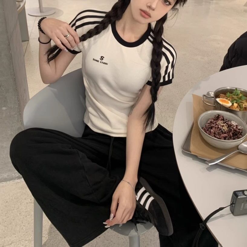 Tシャツ 半袖 レディース 韓国 ファッション リンガー パイピング サイドライン 袖コントラスト おしゃれ ロゴマーク 白T