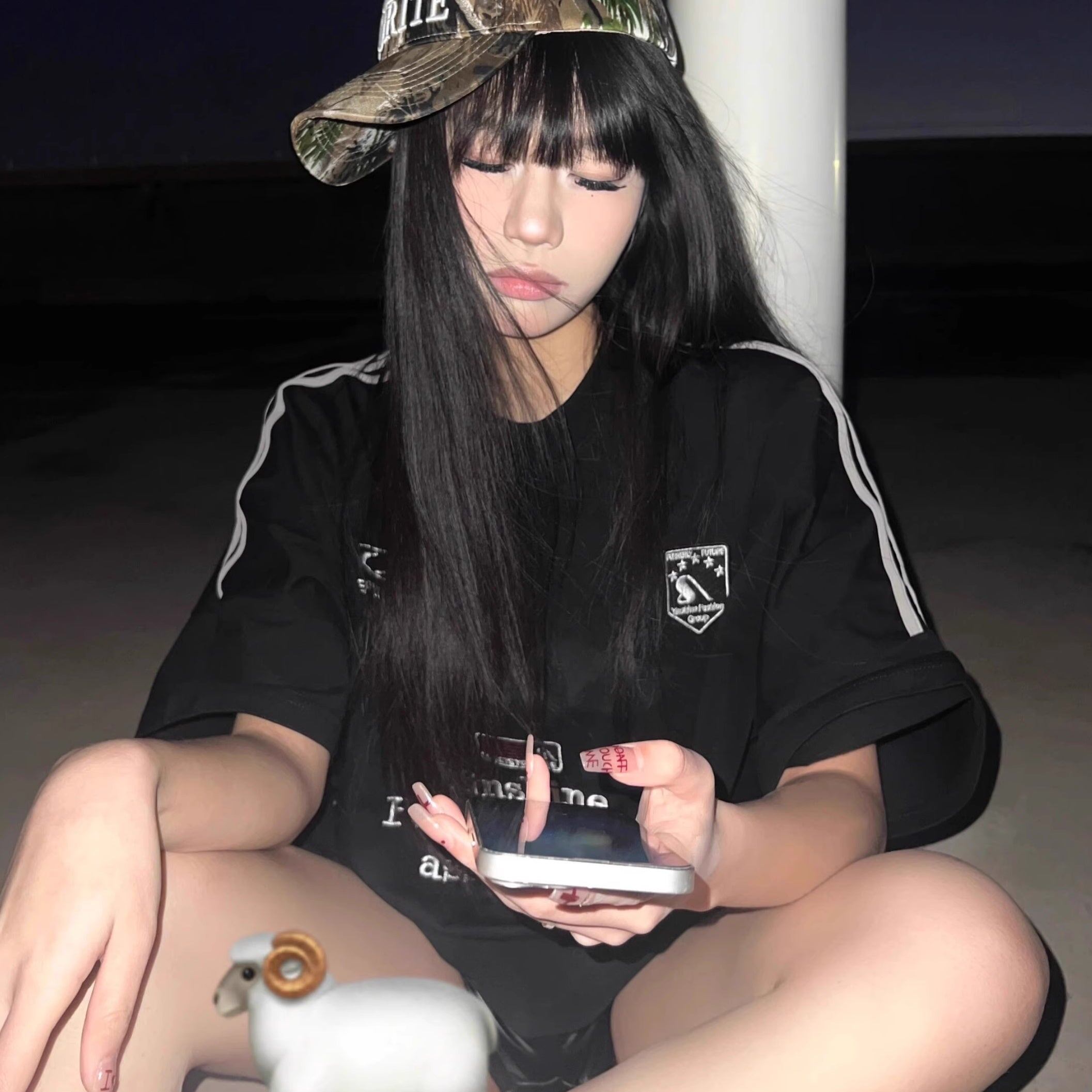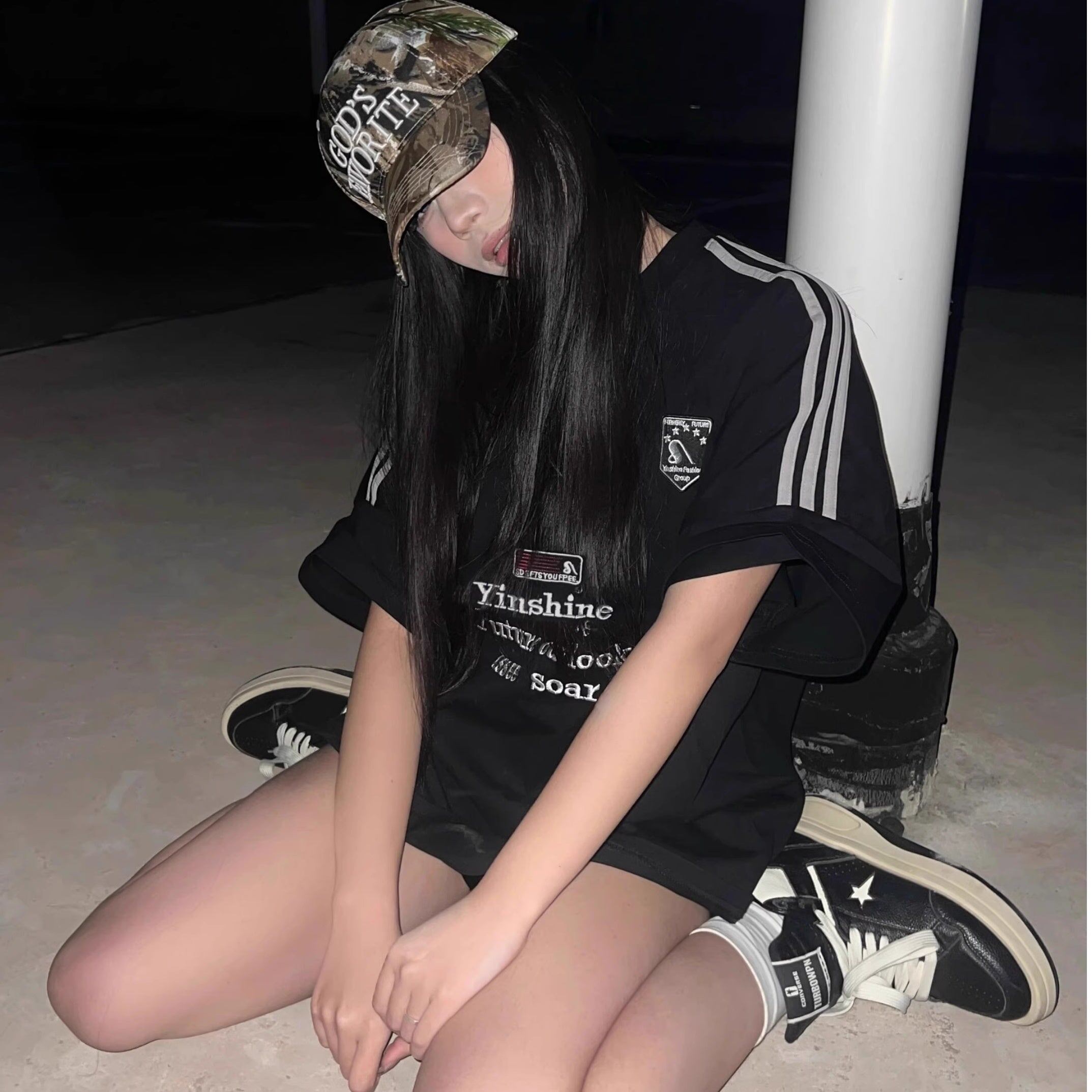 Tシャツ レディース ライン ロゴ ビッグシルエット T 韓国 ファッション スポーティー ストリート