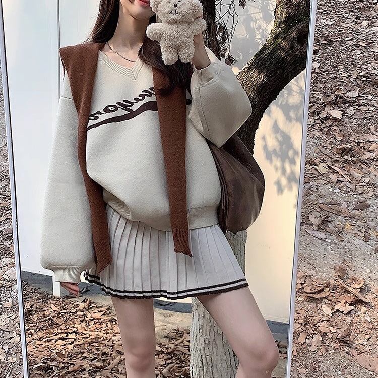 Vネック オーバーサイズ ニット レディース 韓国 ロゴプリント 冬 ニットトップス プレッピー かわいい