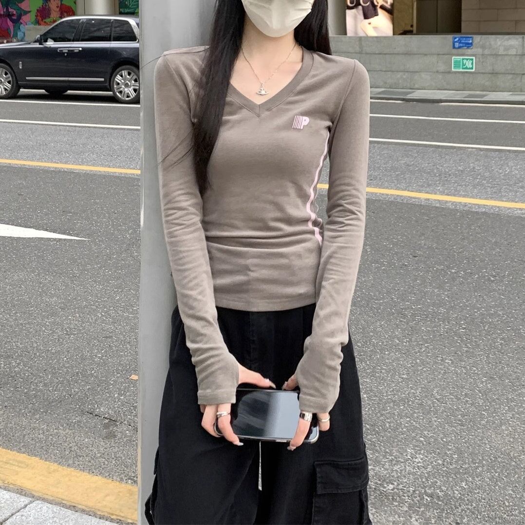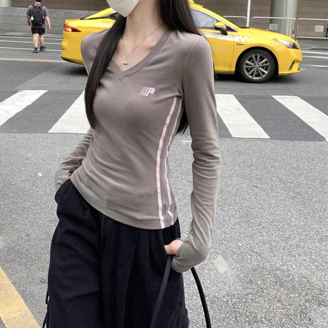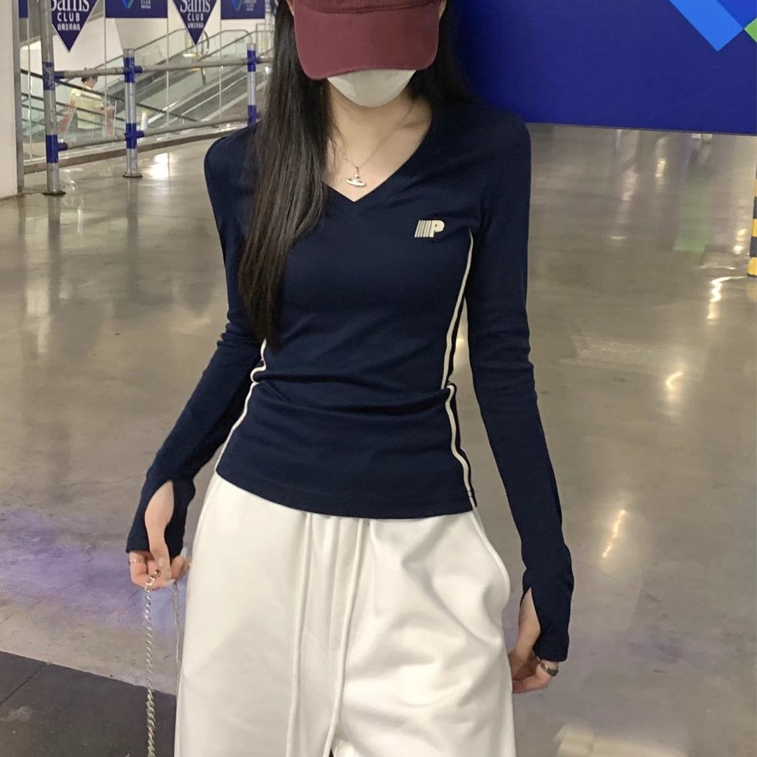 Vネック ストレッチ ロングTシャツ レディース 韓国 ファッション ロゴ ライン ロンT 指抜き ロング袖 タイト カットソー