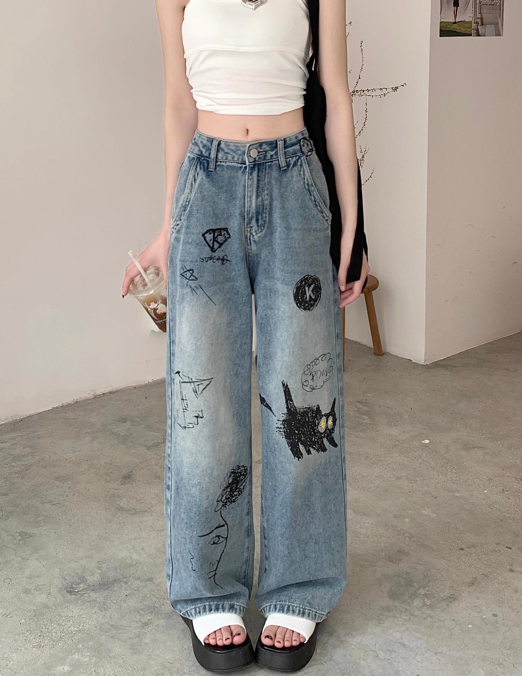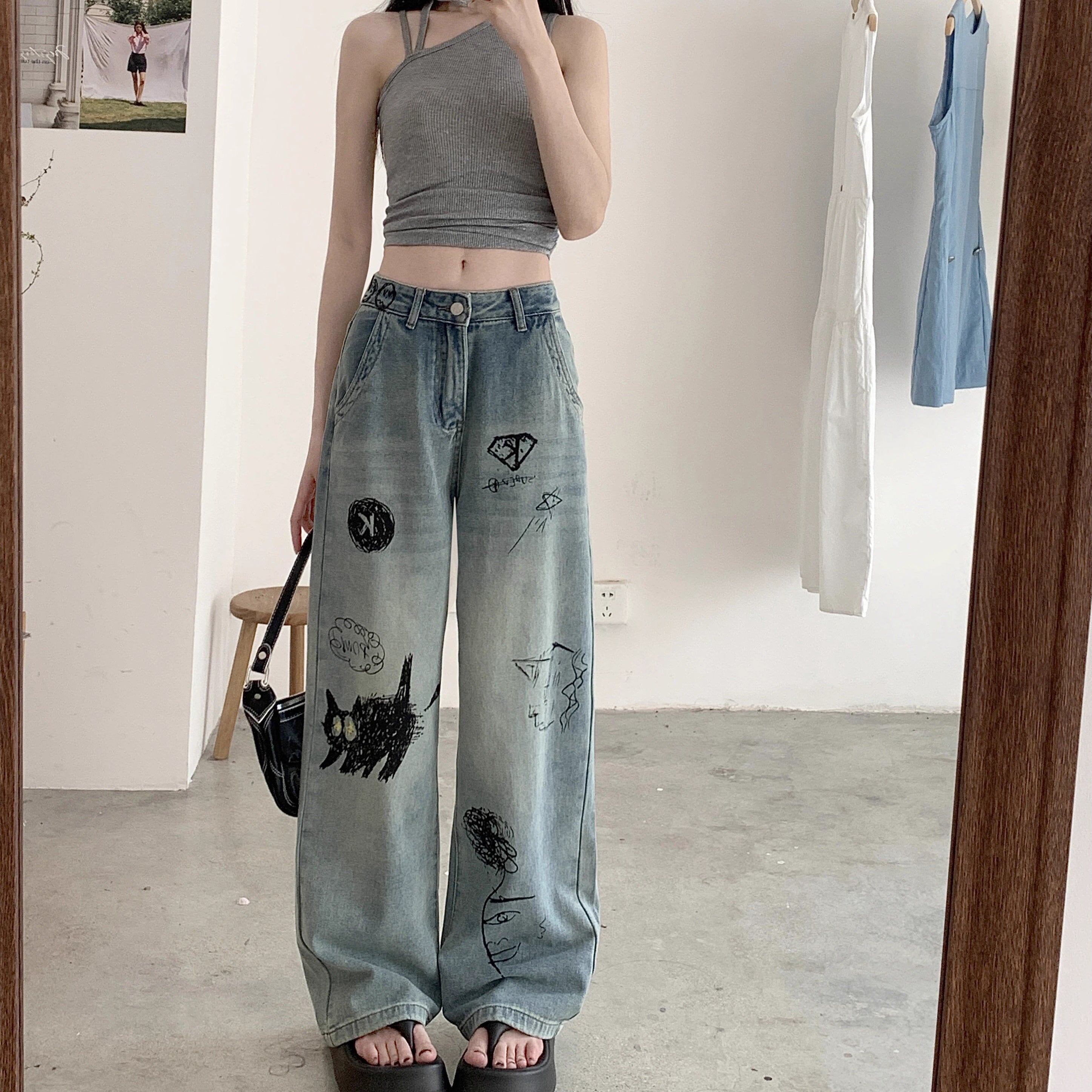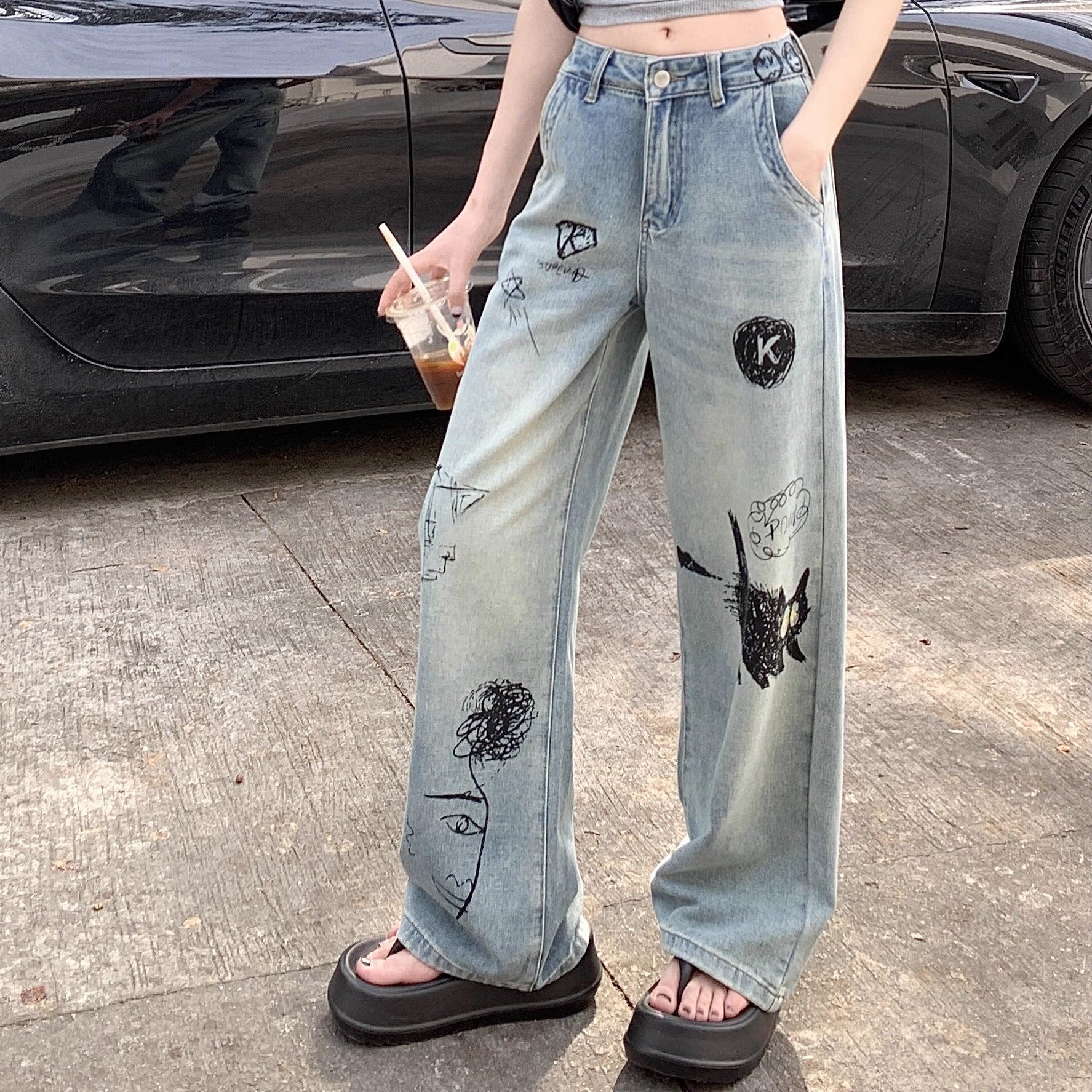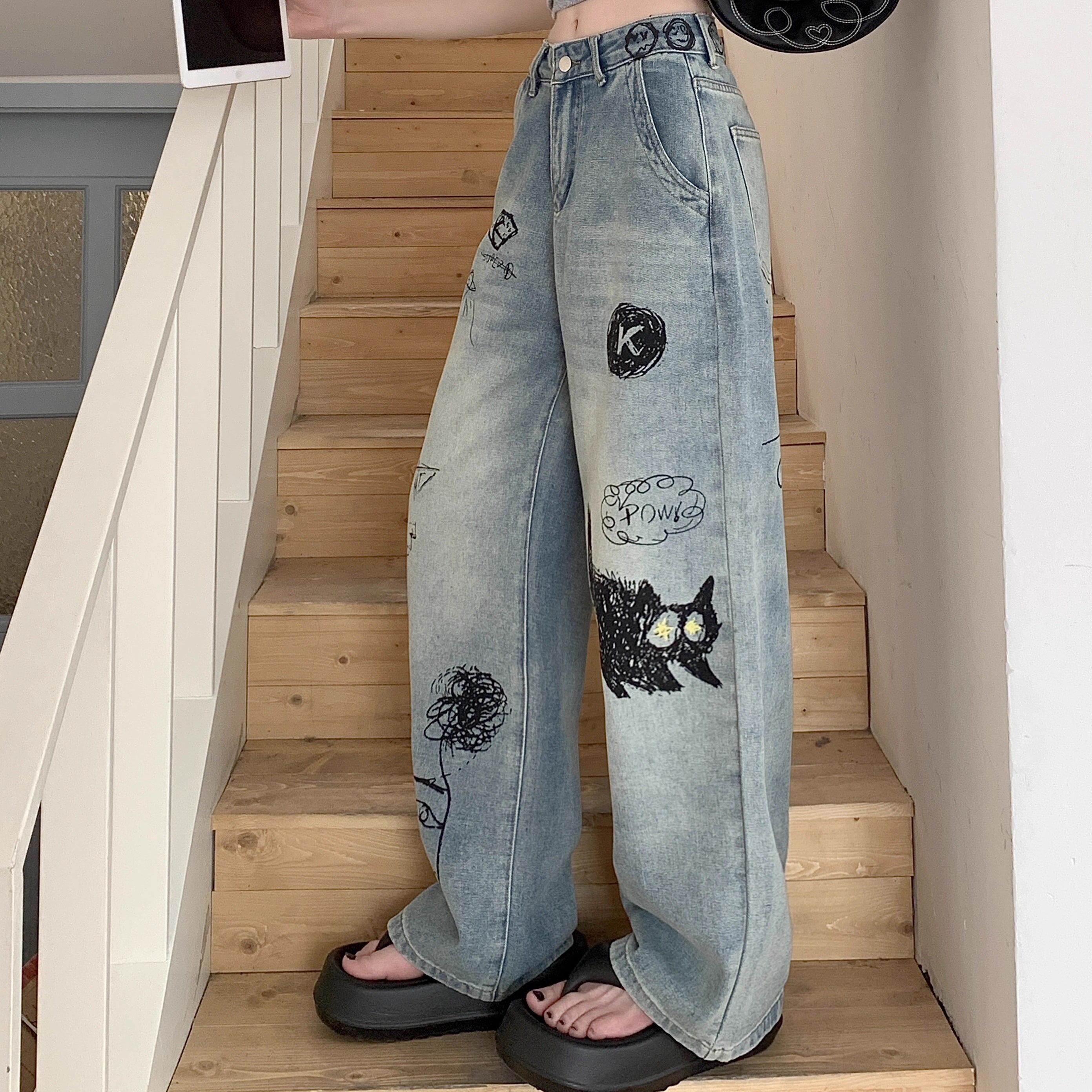 かわいい プリント デニムパンツ レディース 韓国 ファッション 落書き ペイント ダメージ ビンテージデニム 色落ち加工