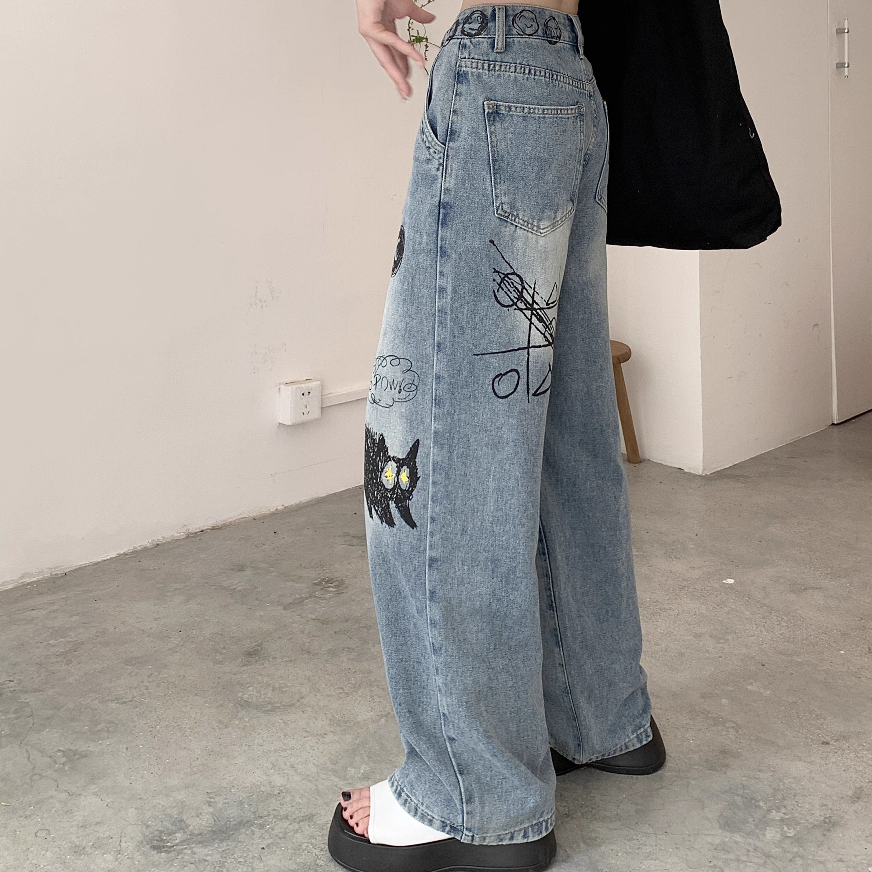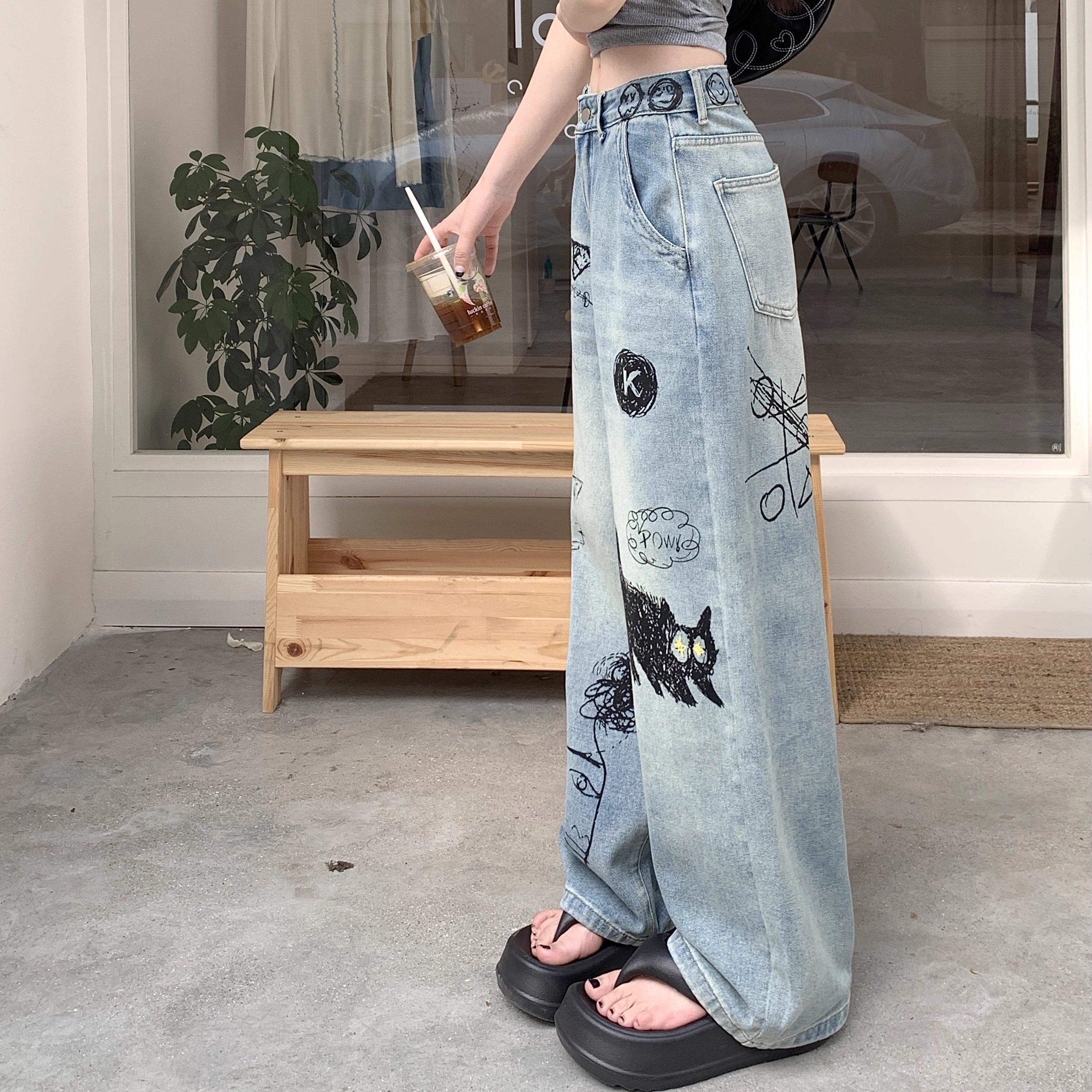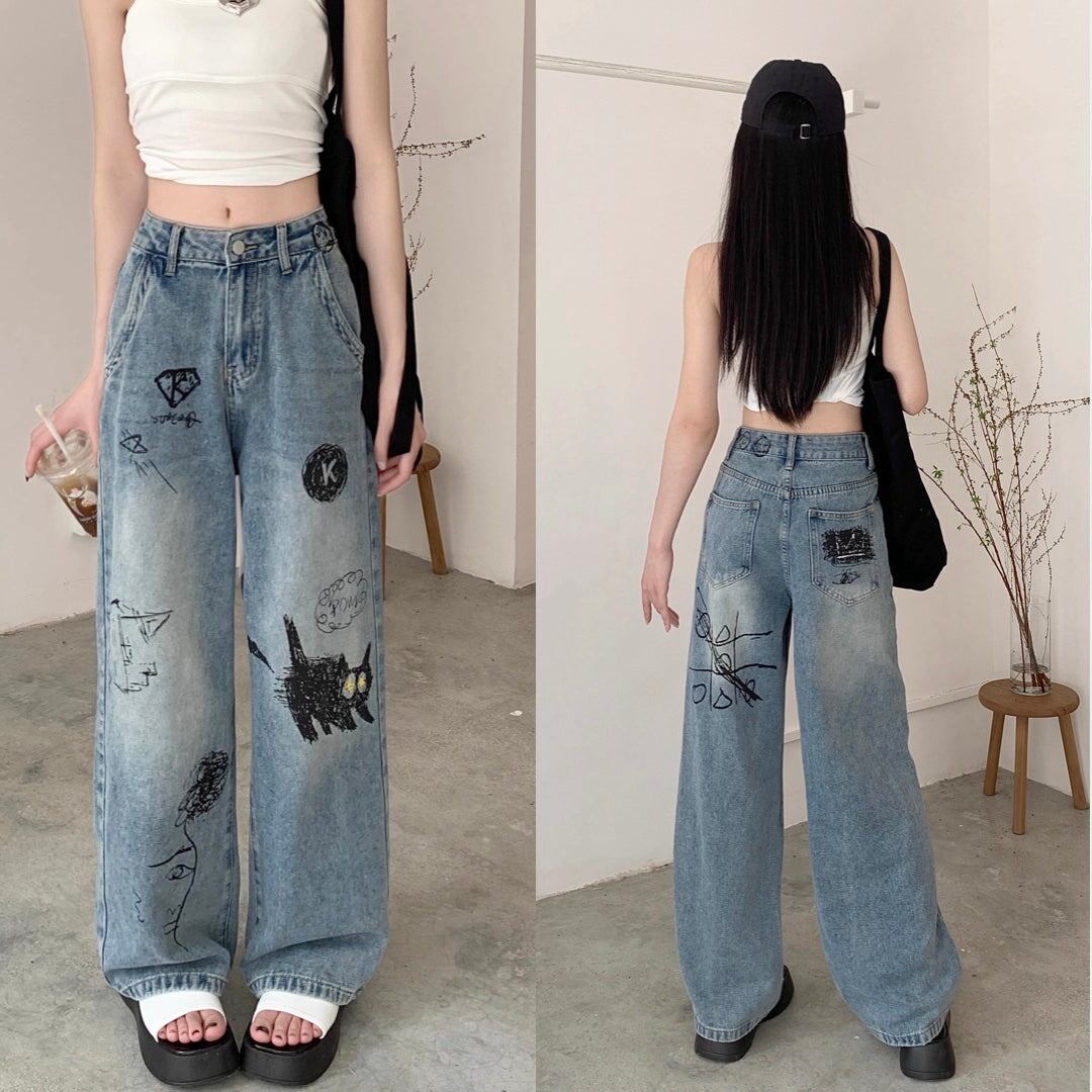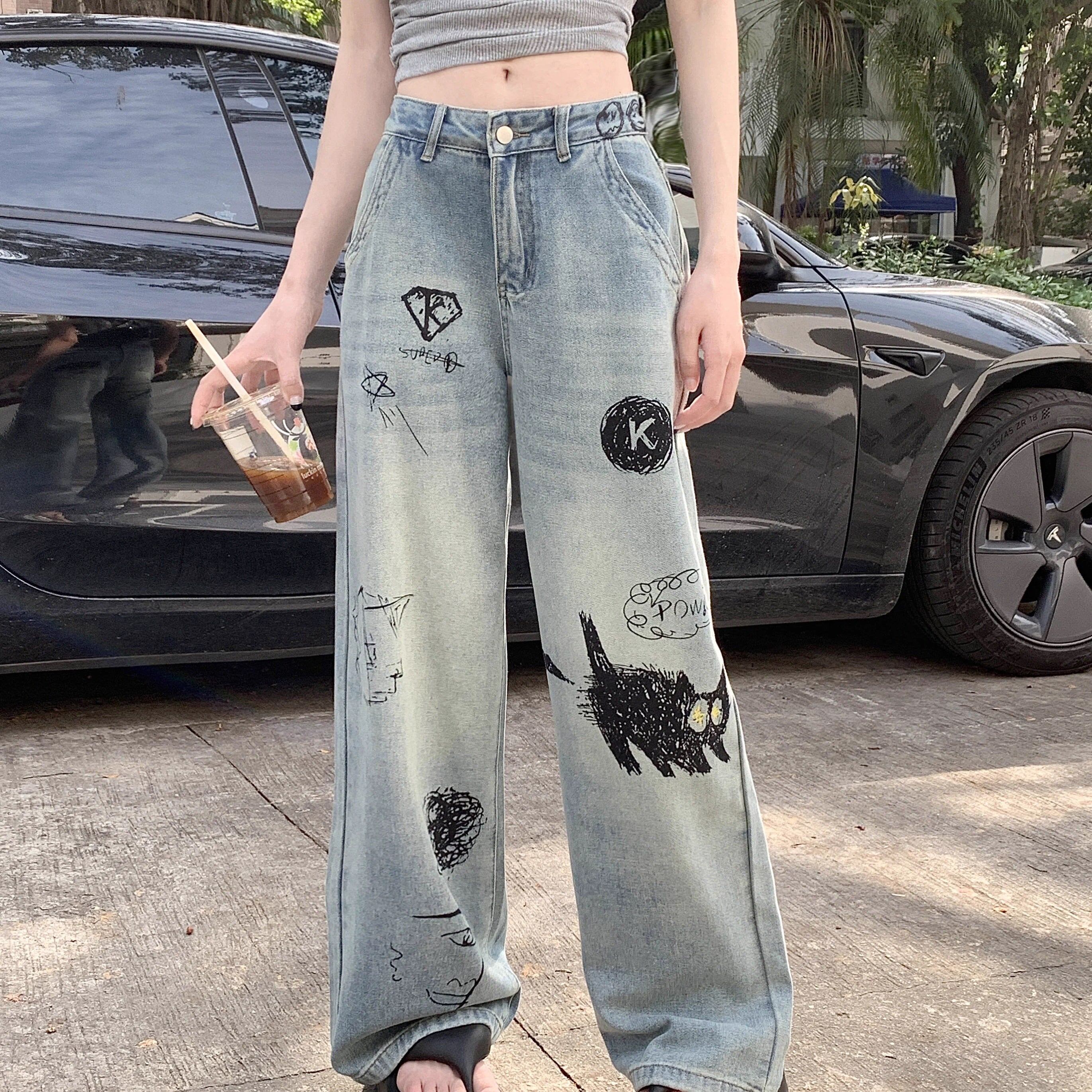 かわいい プリント デニムパンツ レディース 韓国 ファッション 落書き ペイント ダメージ ビンテージデニム 色落ち加工
