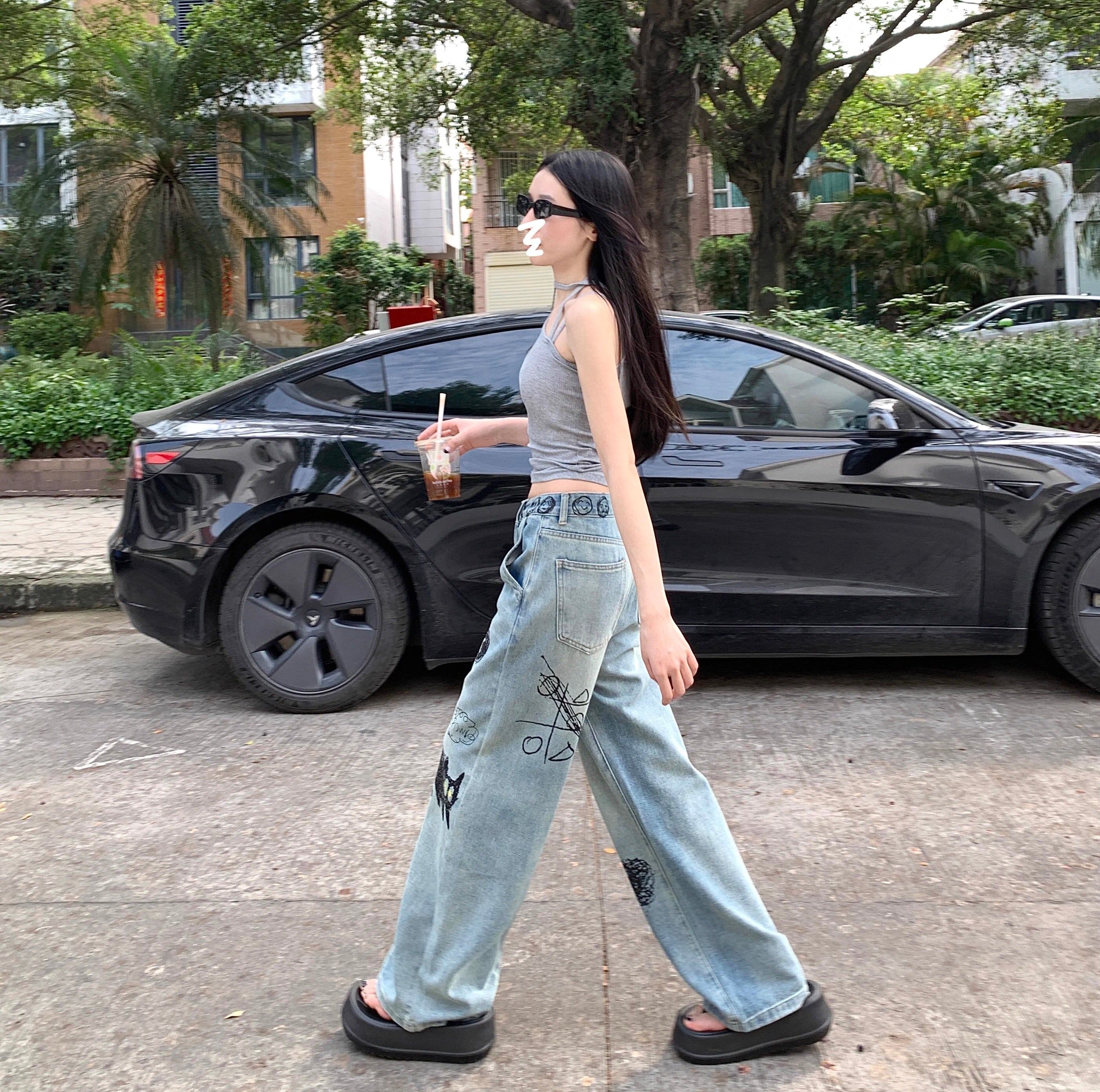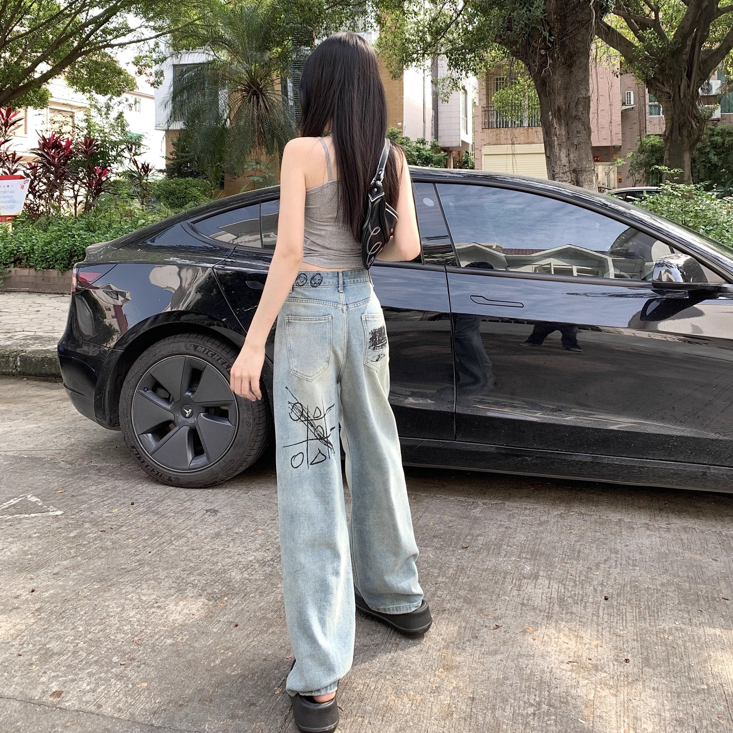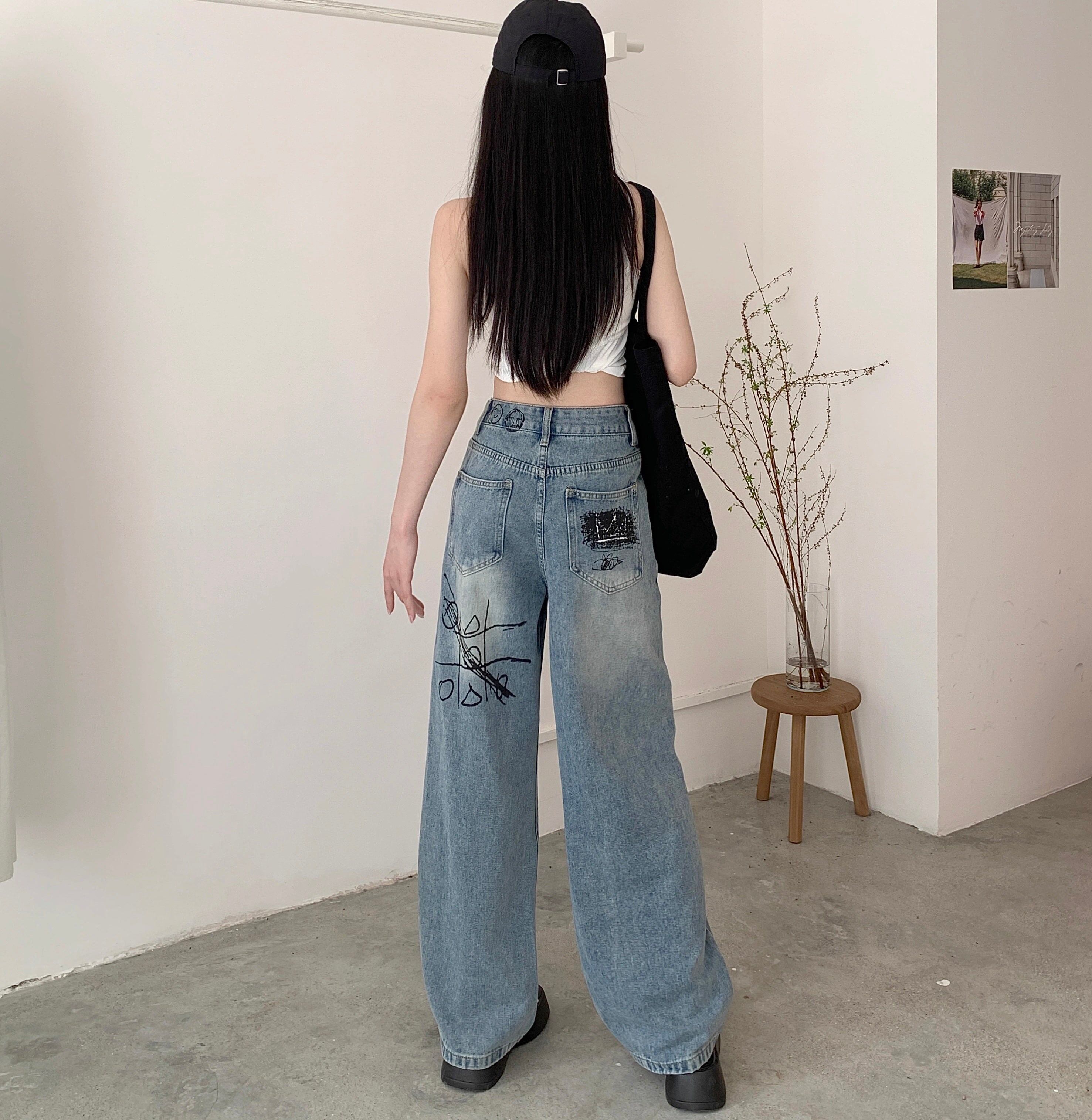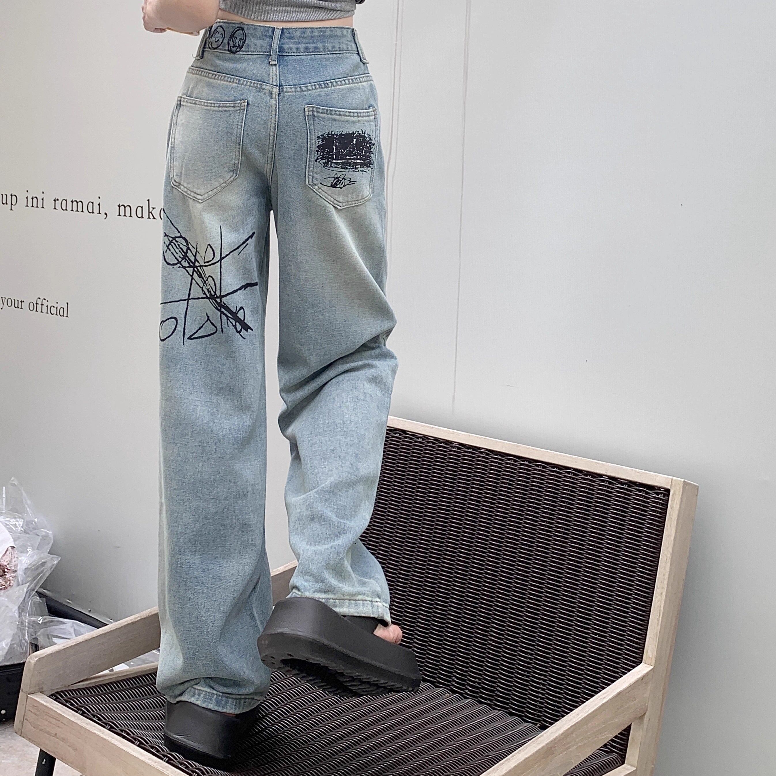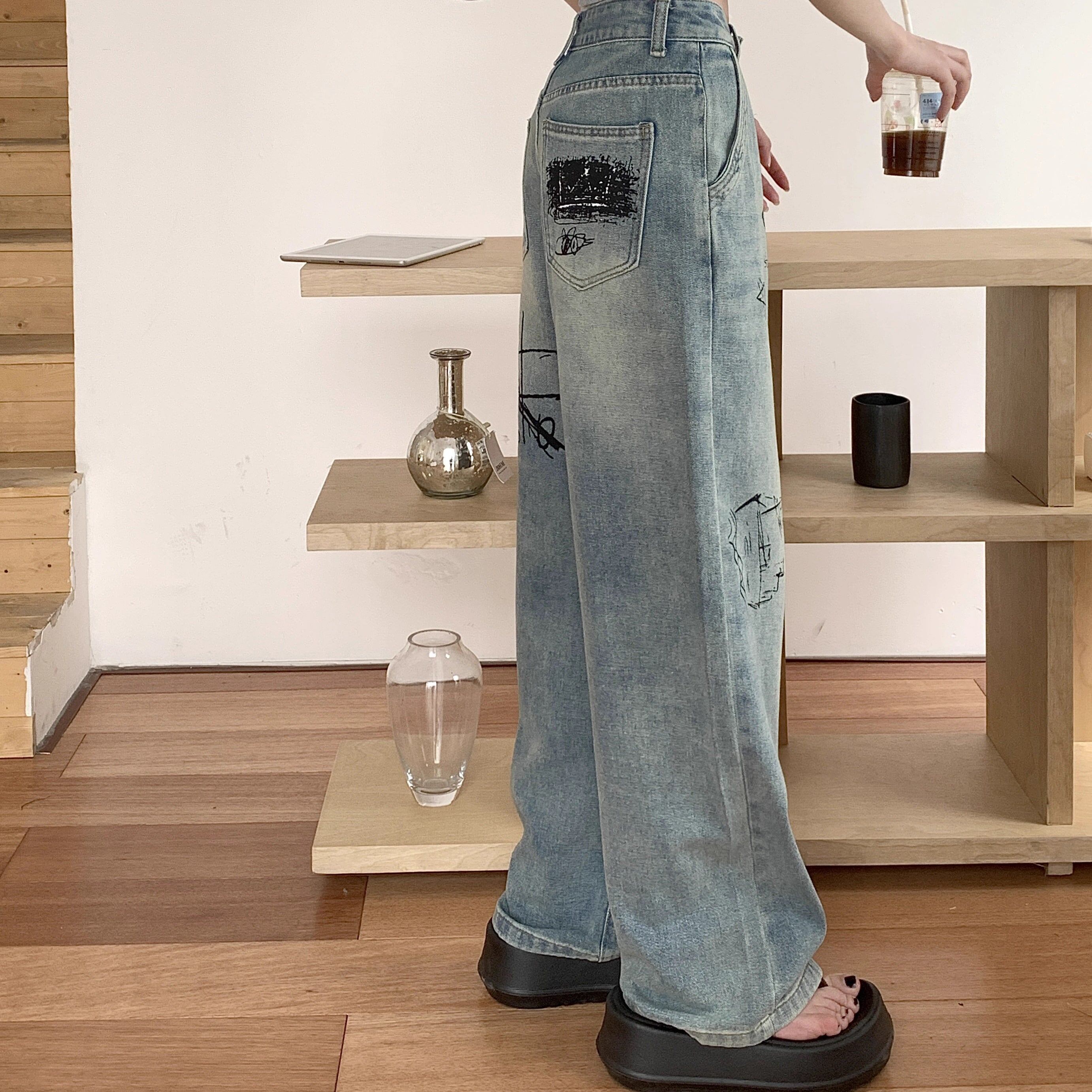 デニムパンツ レディース 韓国 ファッション 落書き ペイント ダメージ ビンテージデニム 色褪せ加工