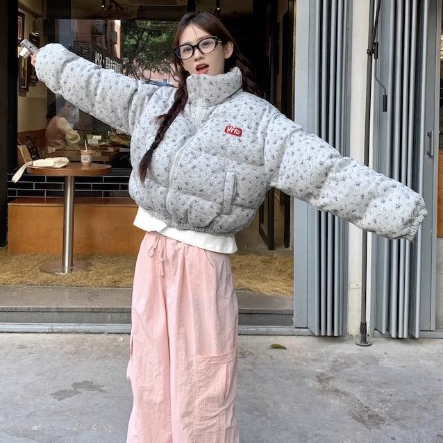エコダウンジャケット レディース 韓国 ファッション 花柄 中綿 アウター ワンポイント ボリューム クロップ丈