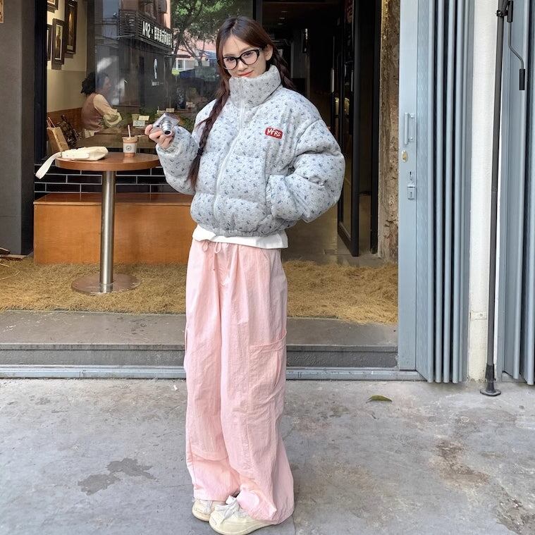 エコ ダウン ジャケット レディース 韓国 アウター クロップ丈 花柄 中綿 ワンポイント ボリューム ショート ジャケット