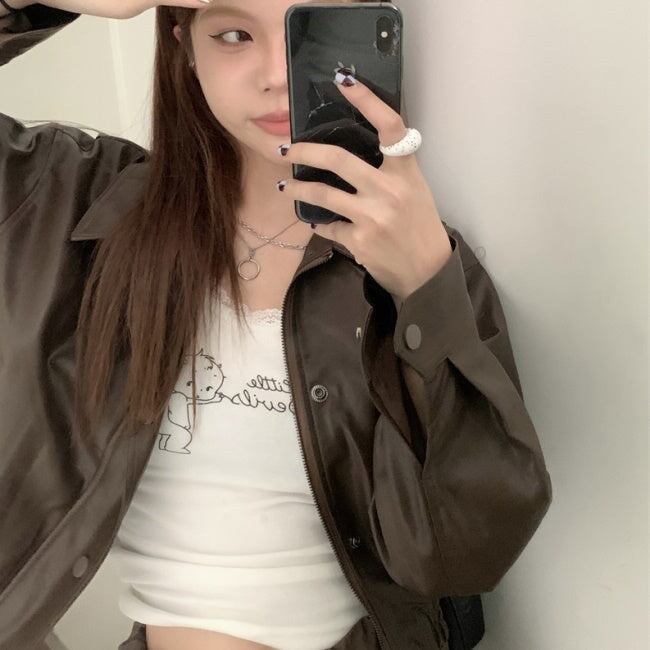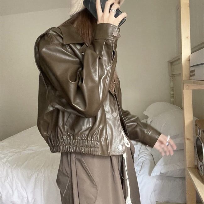 レザージャケット フェイクレザー レディース 韓国 ファッション アウター ジップブルゾン 黒茶 メンズライク バイカー ライダース ショート丈