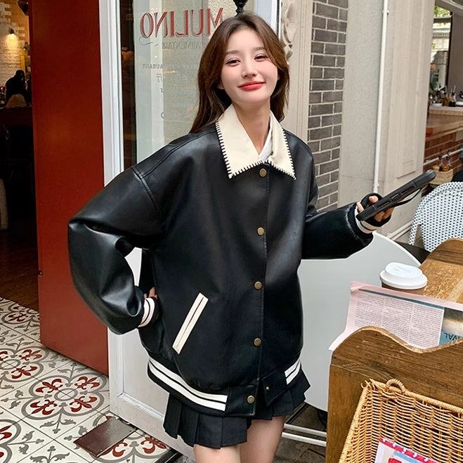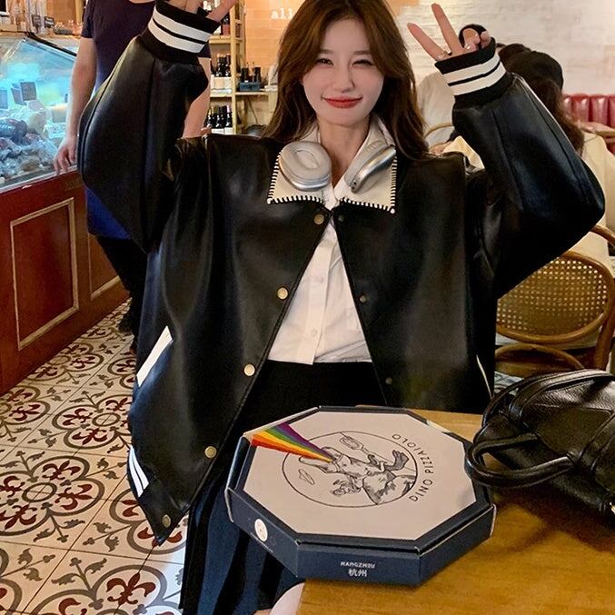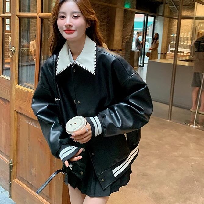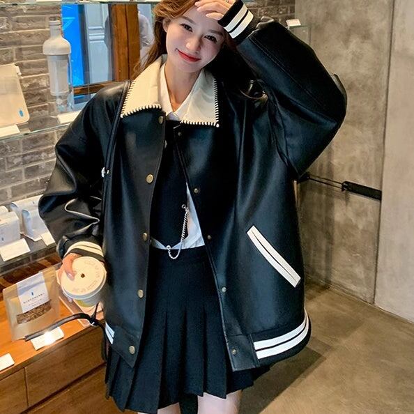 レザージャケット レディース 韓国 ファッション スタジャン スナップ バイカラー モノクロ おしゃれ アウター エコレザー フェイクレザー