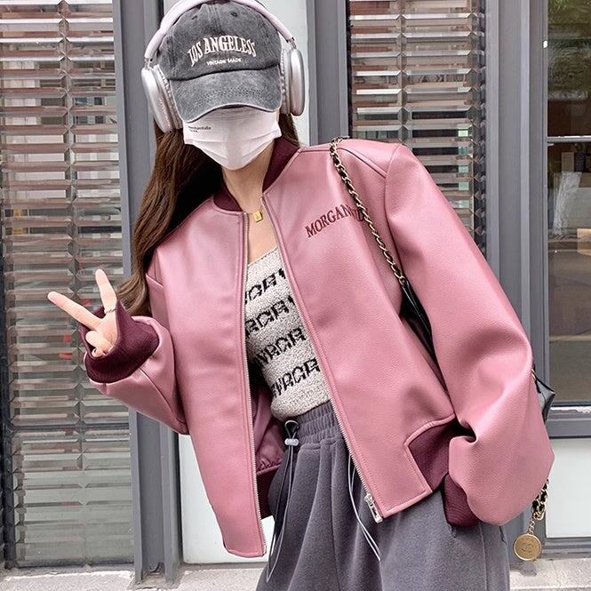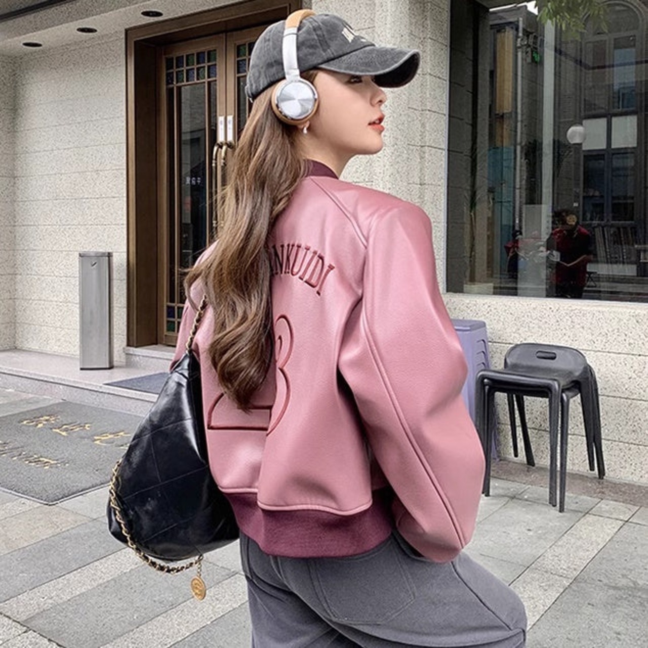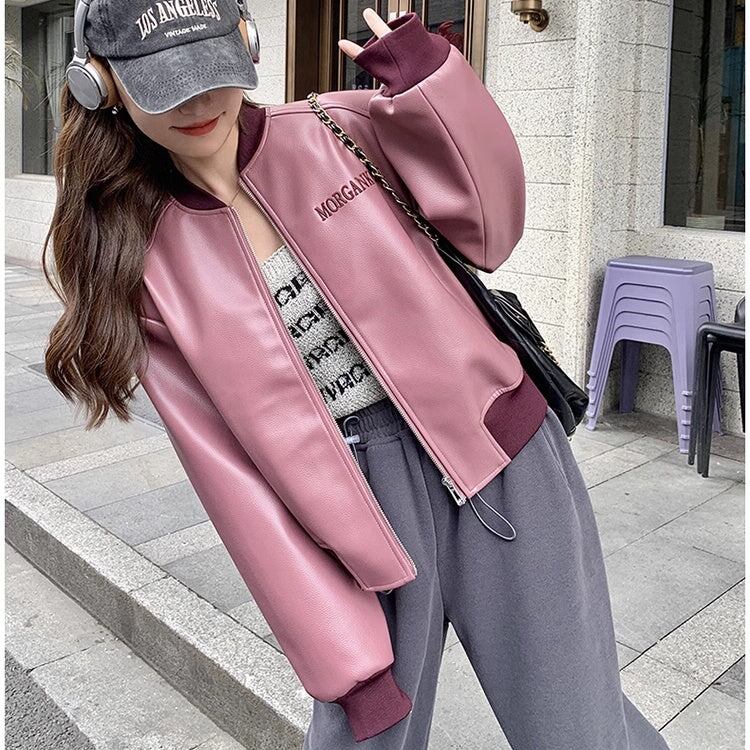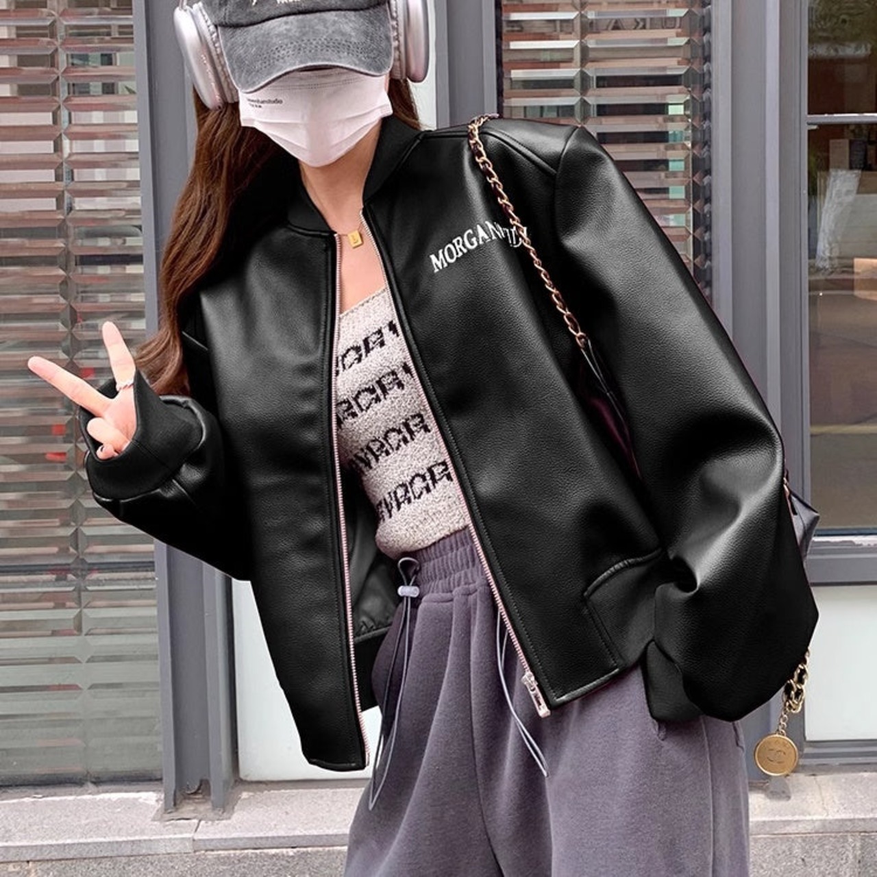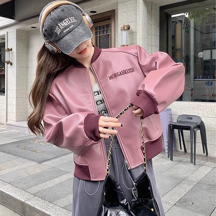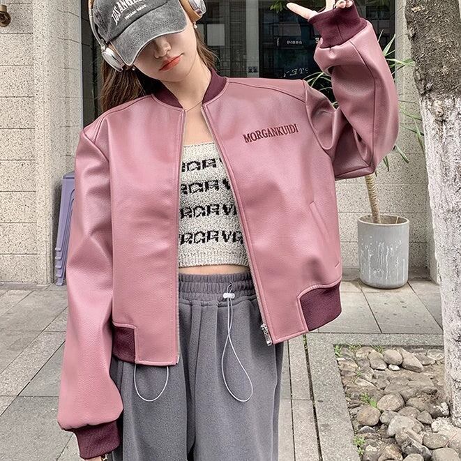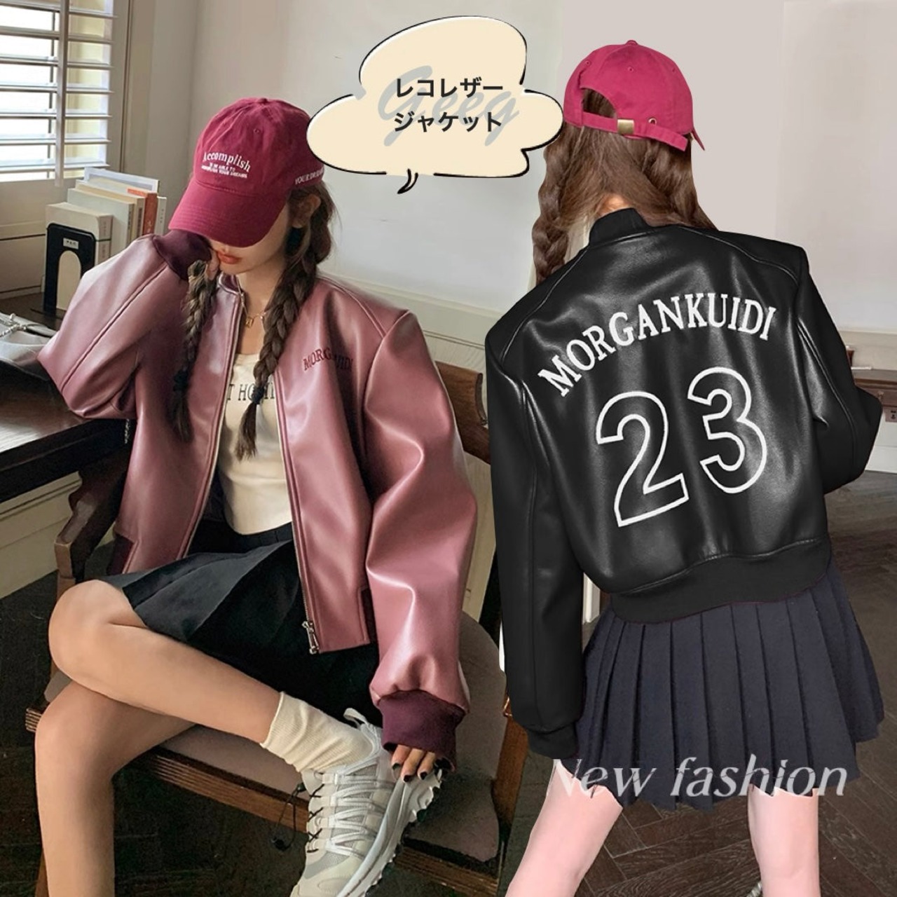 レザーブルゾン レディース 韓国 ファッション プレザー エコレザー フェイクレザー ジップ スタジャン ナンバーロゴ バックシャン ショートジャケット