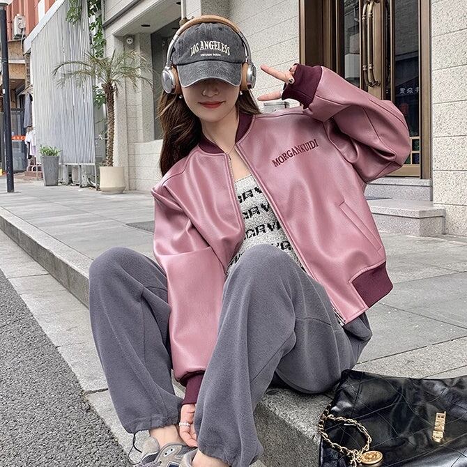 エコレザー ジャケット レディース 韓国 ファッション バックロゴ ノーカラー ブルゾン アウター