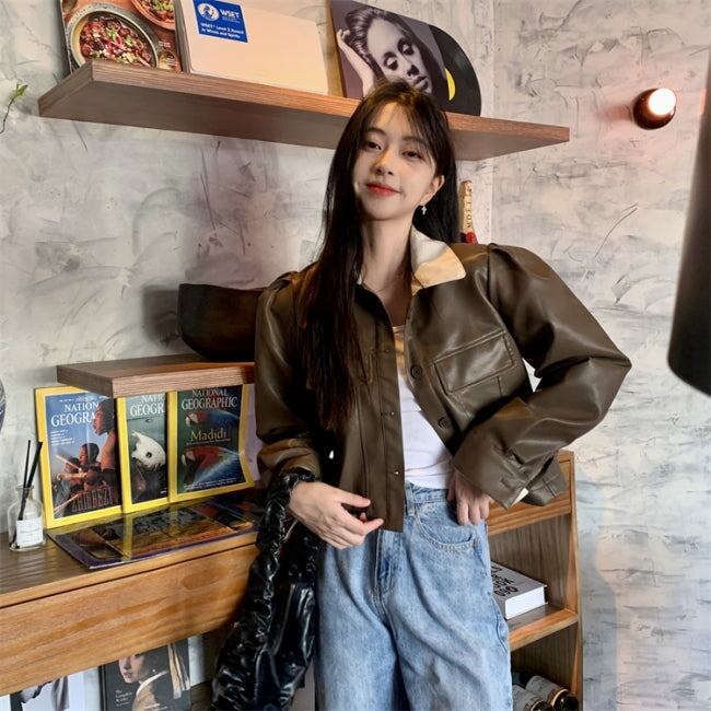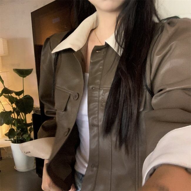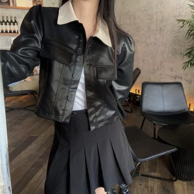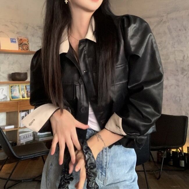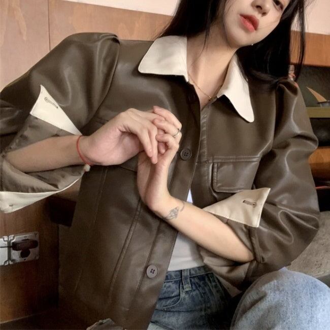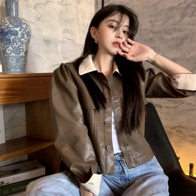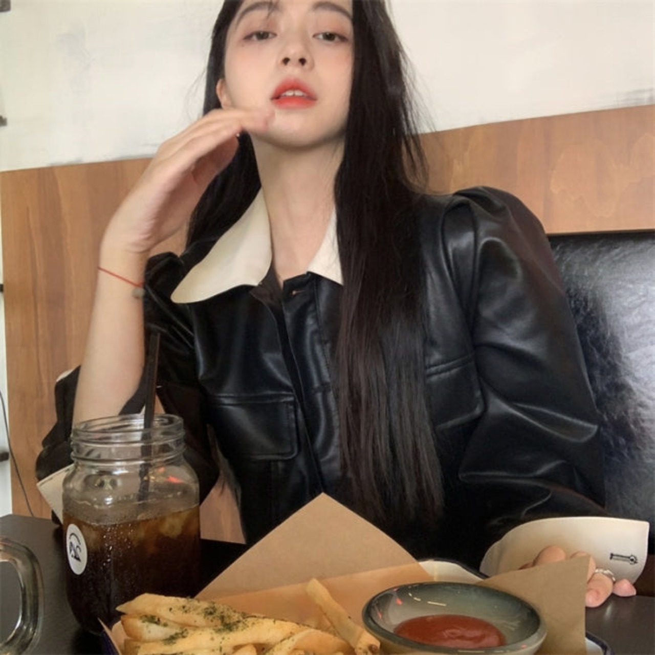 レザージャケット レディース 韓国 ファッション フェイクレザー プレザー ライダース ブルゾン バイカラー キャメル ブラック 春アウター レイヤード 大人