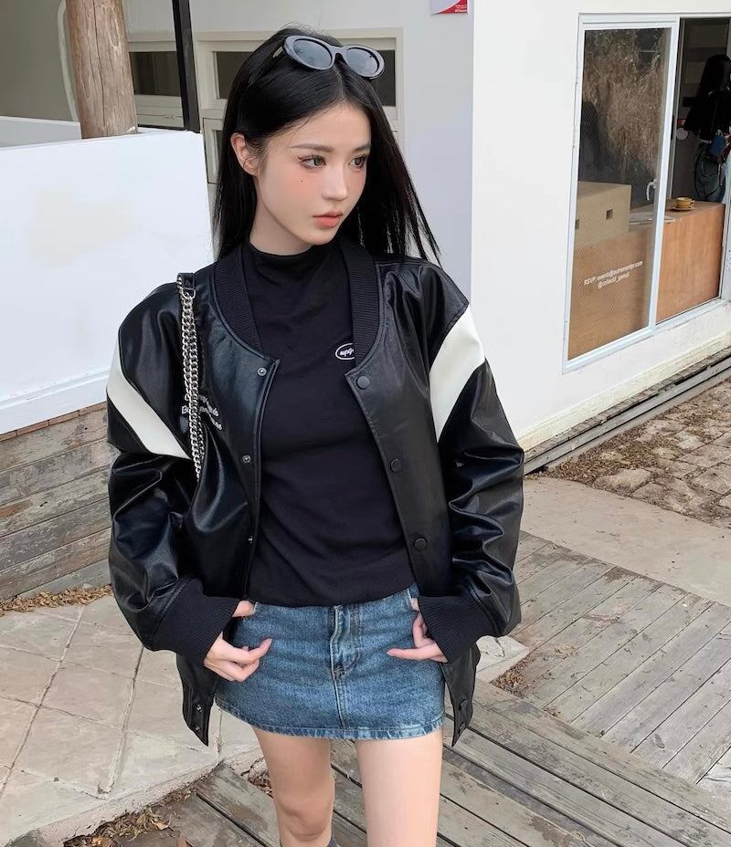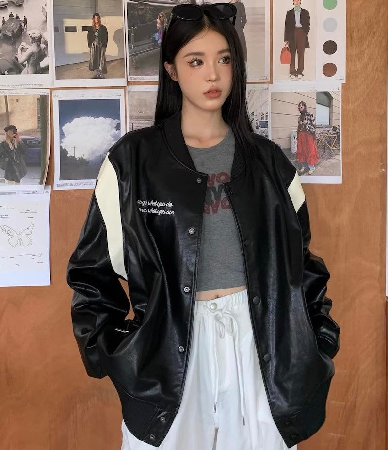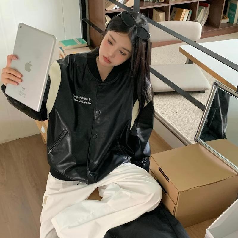 レザージャケット レディース 韓国 ファッション スタジャン バイカラー オーバーサイズ ビッグシルエット 黒ブルゾン フェイクレザー 合皮