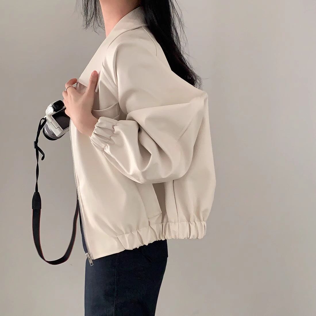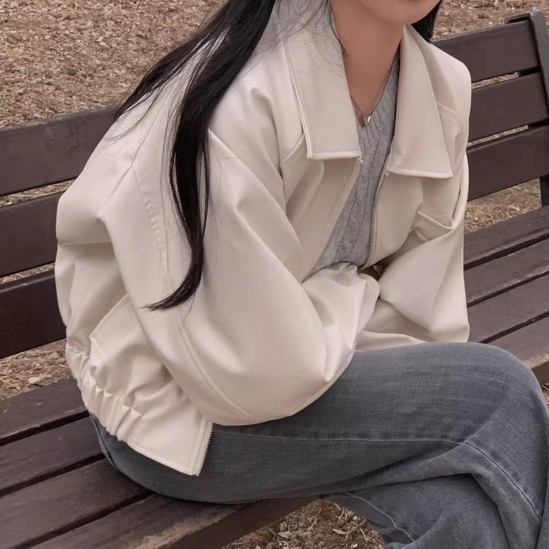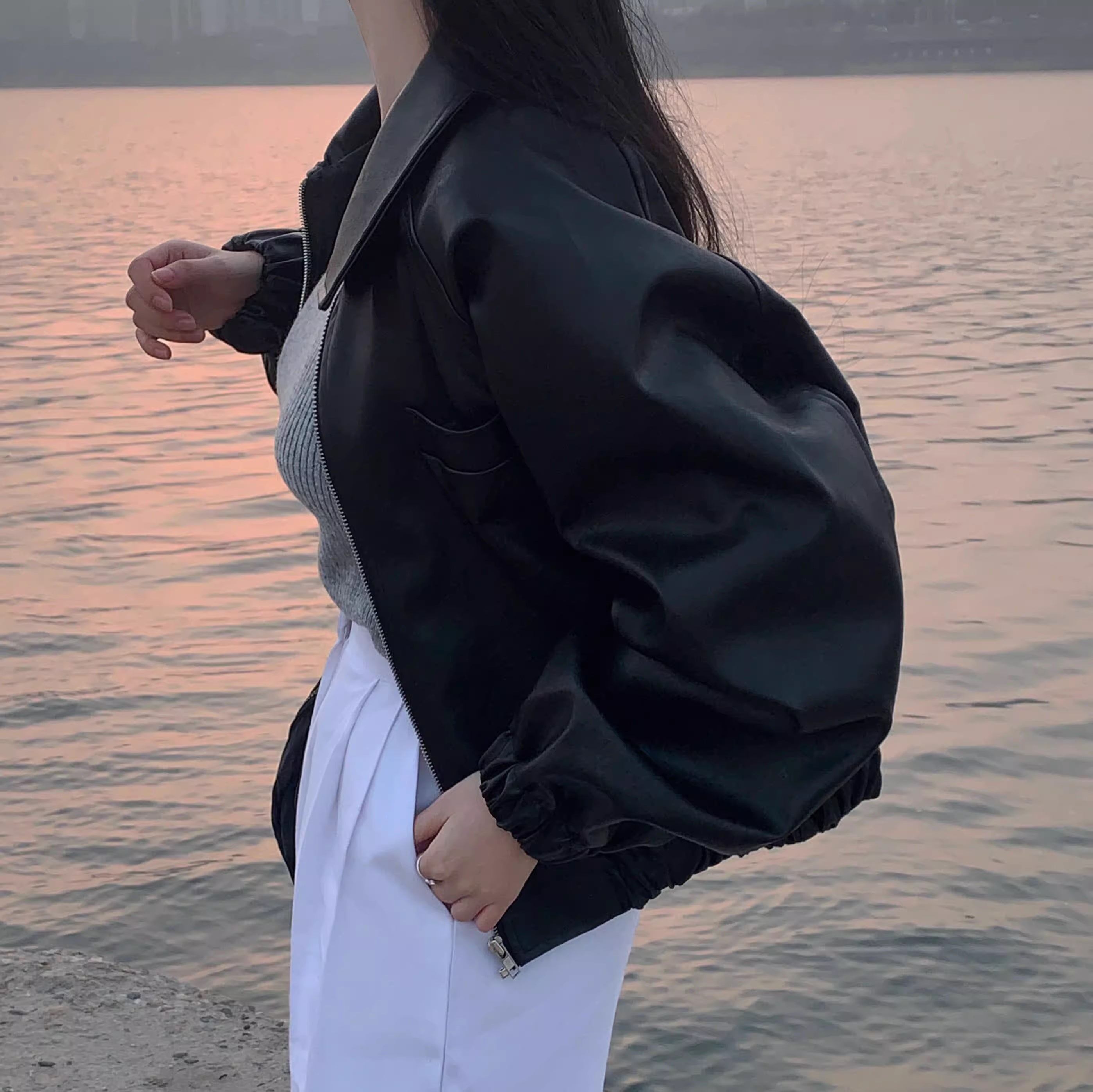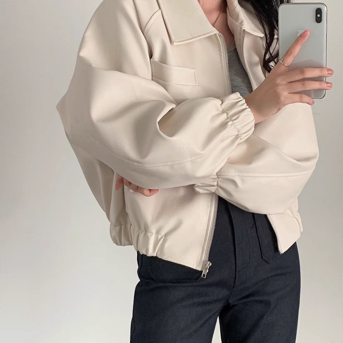 レザージャケット レディース 韓国 ファッション 無地 合皮 フェイクレザー ジップブルゾン ビッグシルエット おしゃれアウター