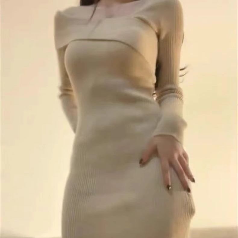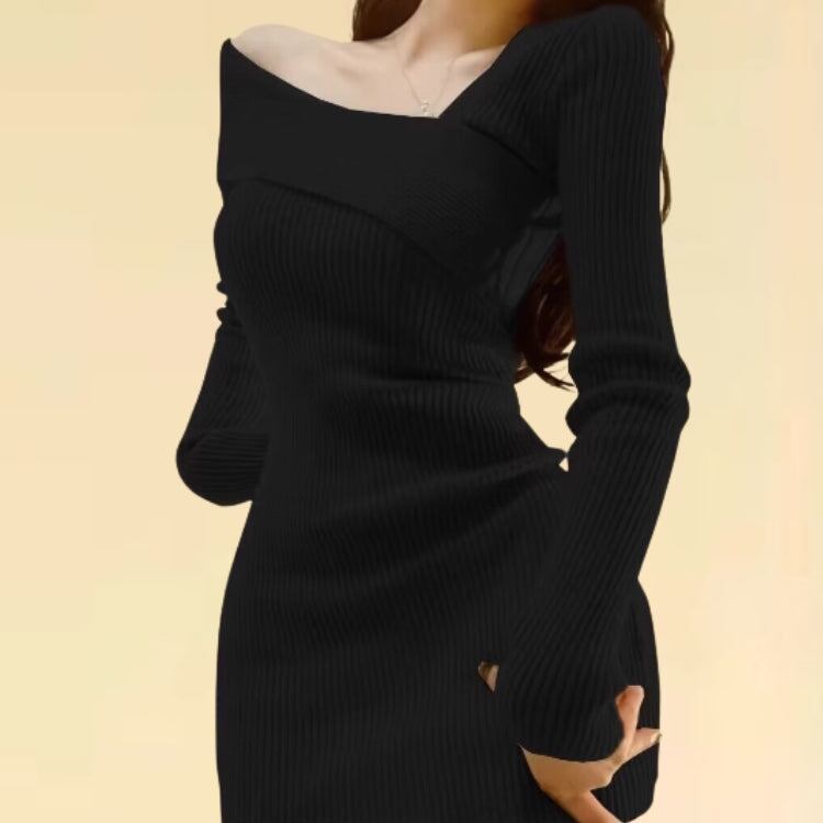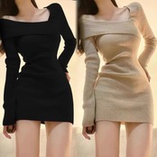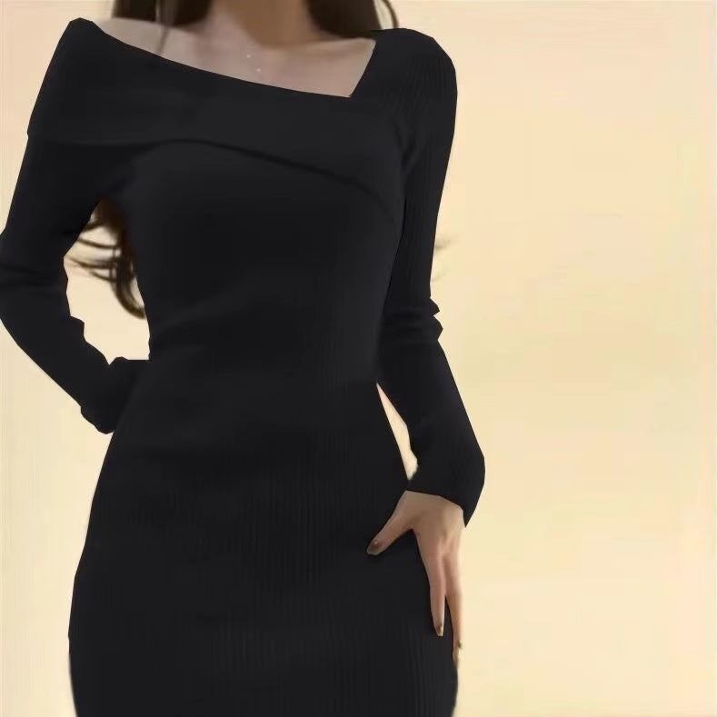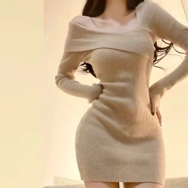 ニットワンピース レディース 韓国 ファッション アシンメトリー デコルテ 広めネック フィットタイトワンピース ミニマム ショートワンピース ミニスカート ミニワンピ 冬ワンピース ニットカットソー