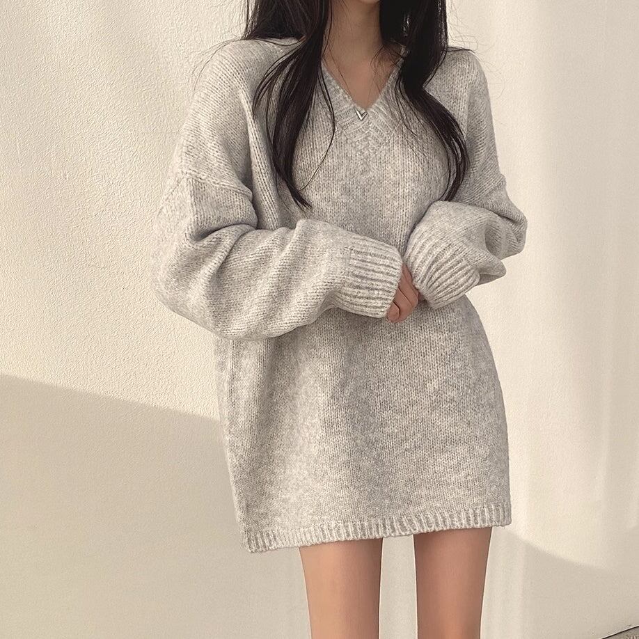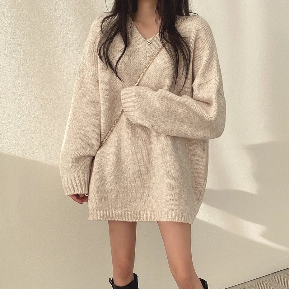 ニットワンピース レディース 韓国 ファッション ミニワンピース ふんわり オーバーサイズ Vネック 厚手ニット