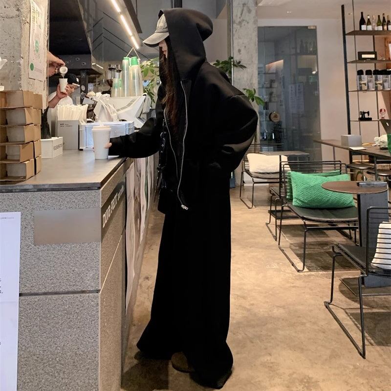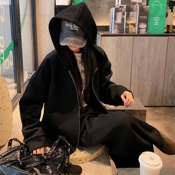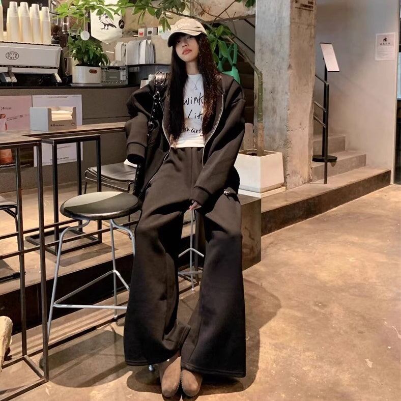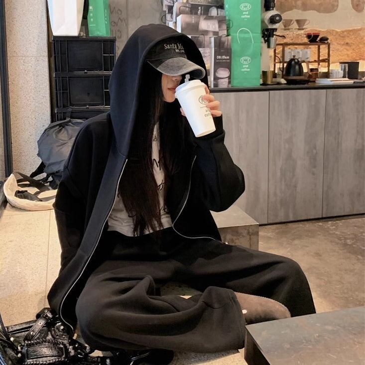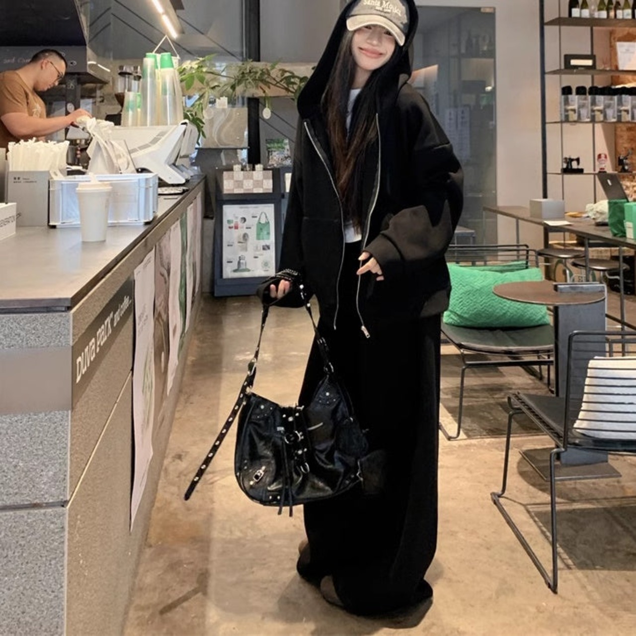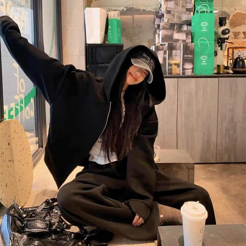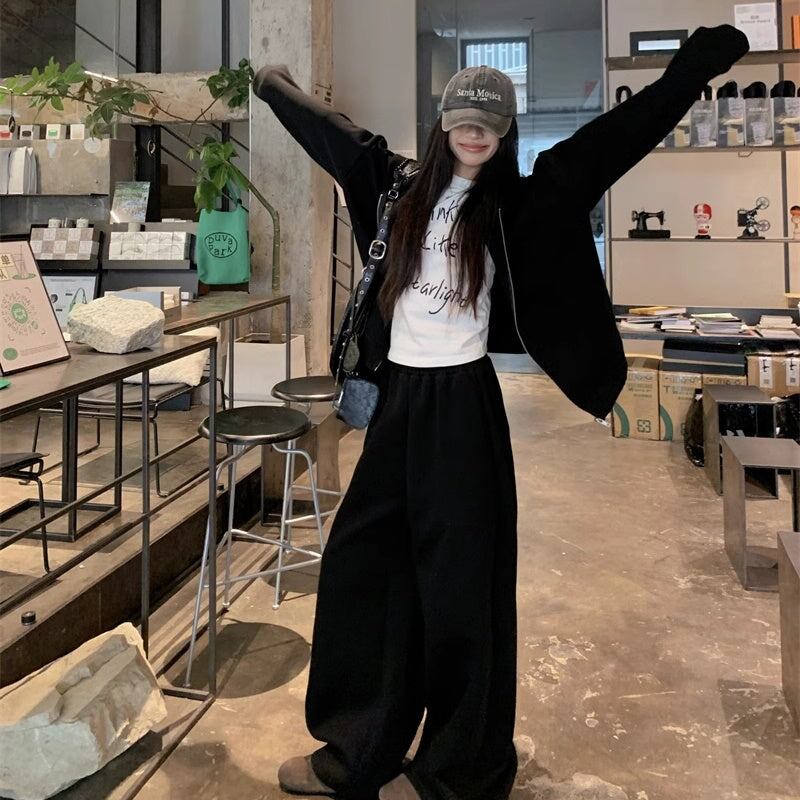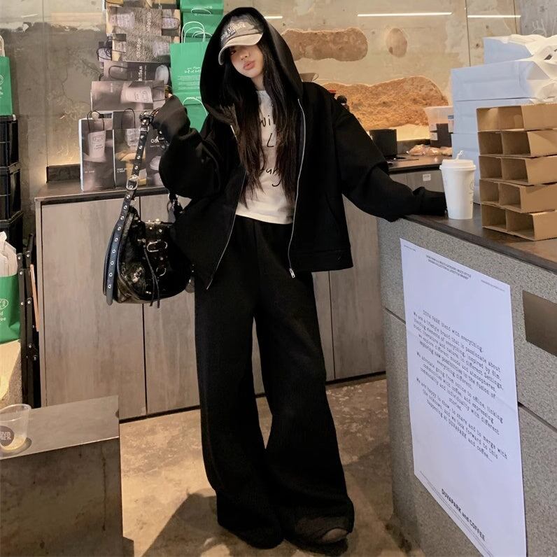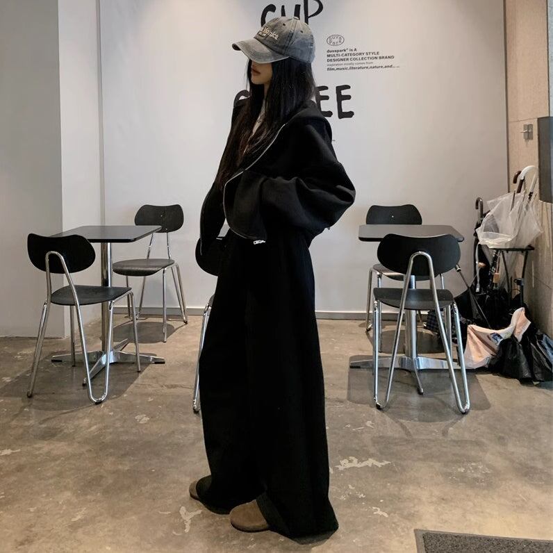 スウェットセットアップ 黒パーカー レディース 韓国 ファッション 黒パンツ 上下2点セット 大人 カジュアル ストリート ジップアップ ストレートパンツ