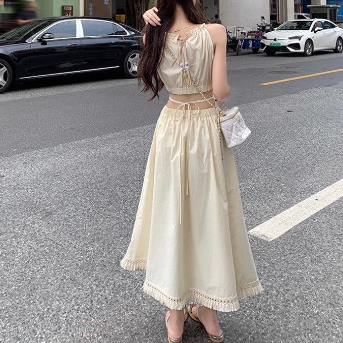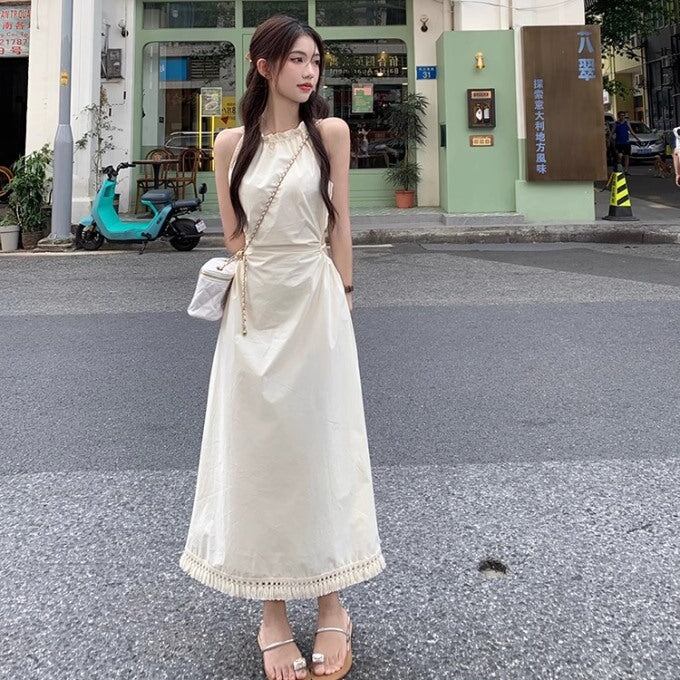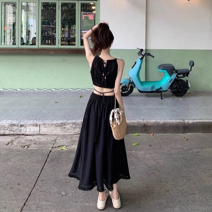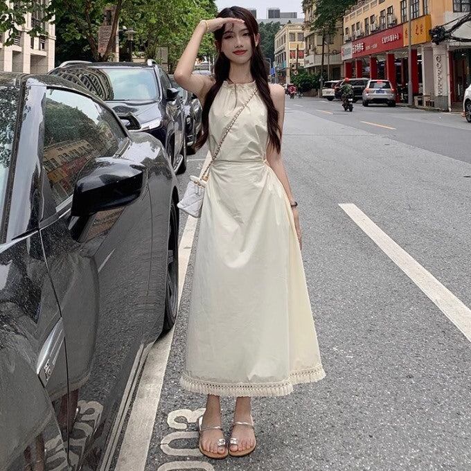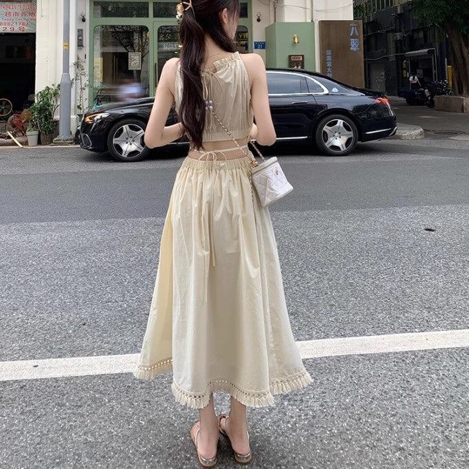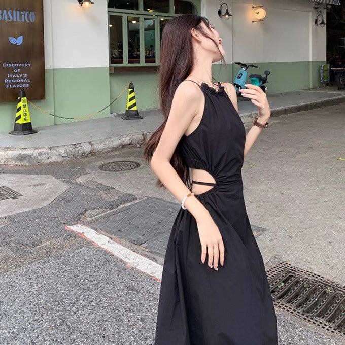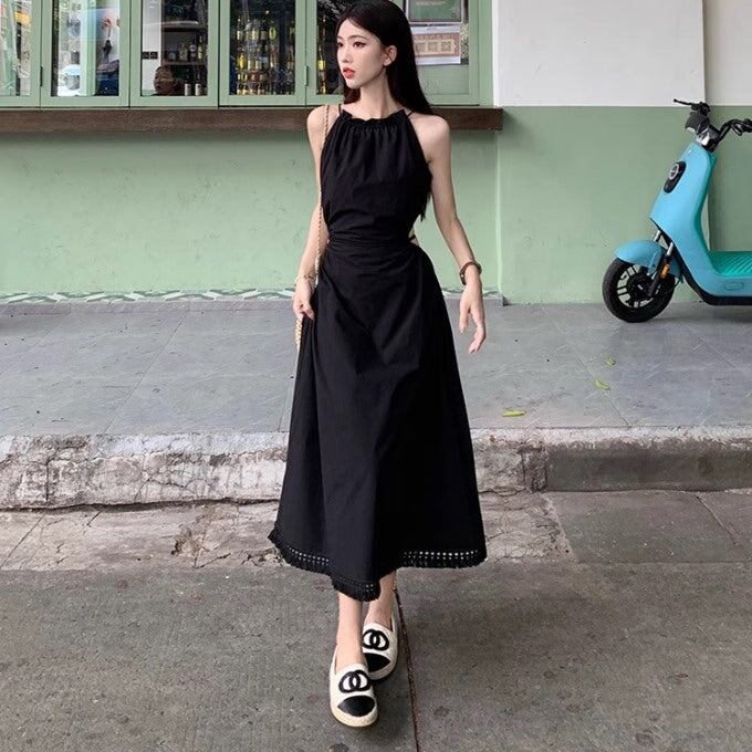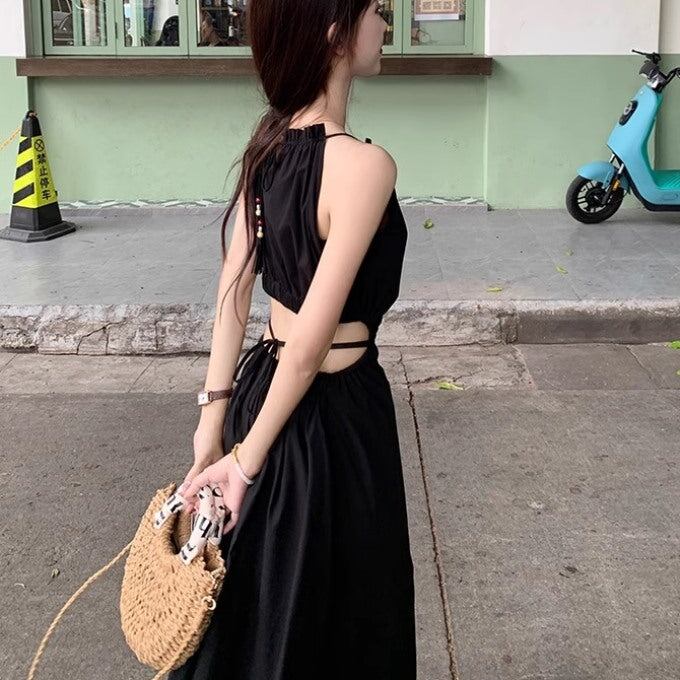 夏 ワンピース レディース 韓国 ファッション カットアウト 背中見せ デザイン Aラインロングフレア バックシャン