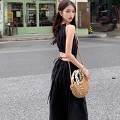 カットアウト ワンピース 韓国 背中見せ ロングワンピース ノースリーブ リボン サマーワンピ
