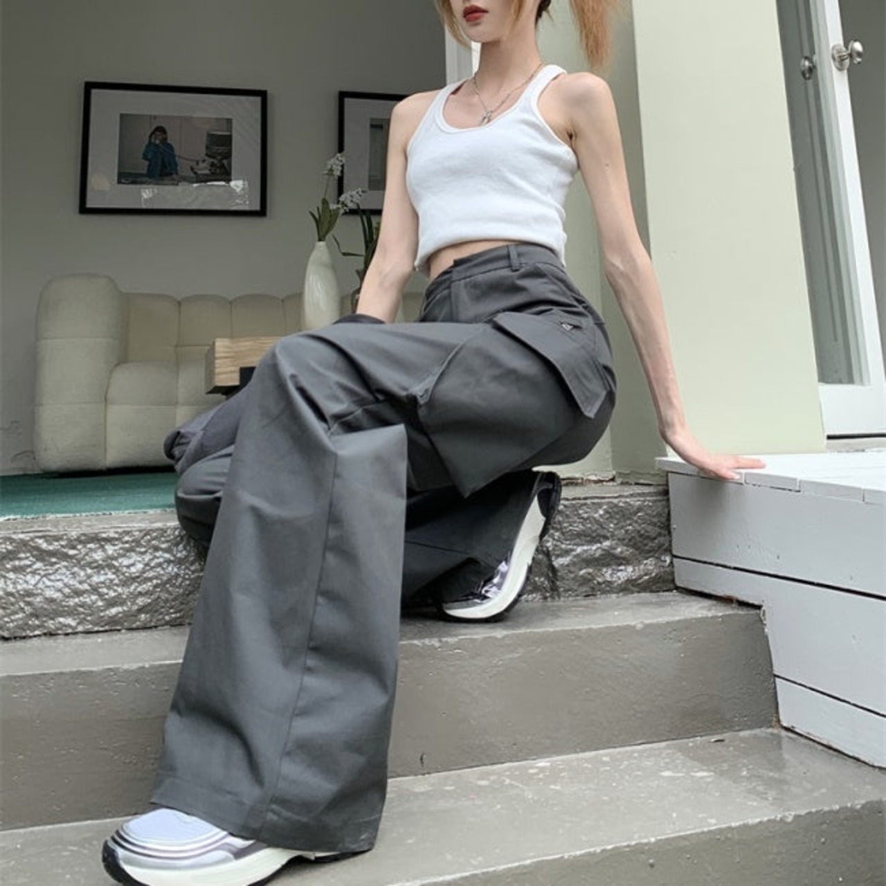 カーゴパンツ ロング レディース 韓国 ファッション サイドポケット ミリタリー パンツ カジュアル アウトドア ワイドシルエット フレア裾