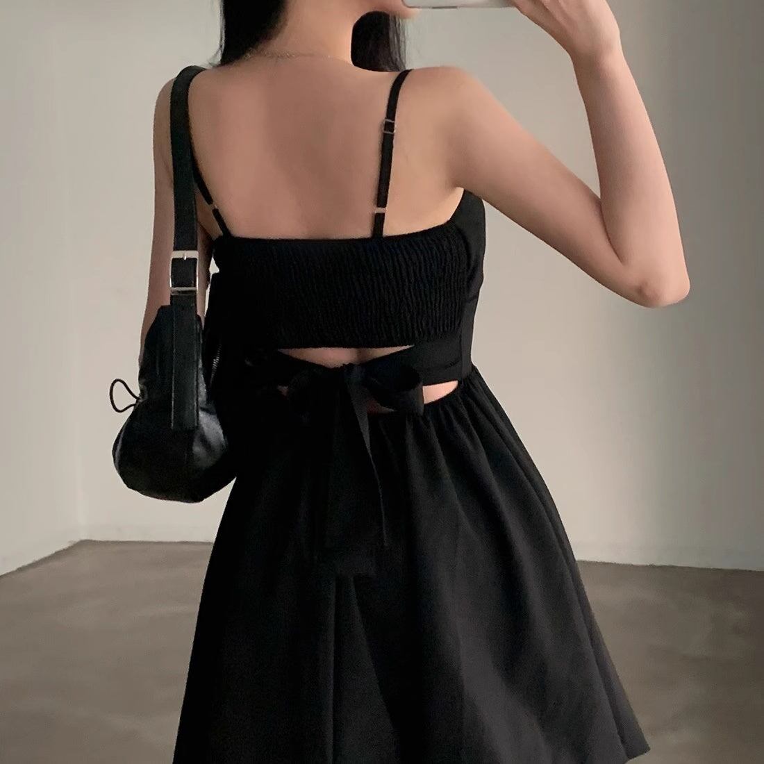 ワンピース ミニドレス レディース 韓国 ファッション キャミワンピ ノースリーブ お呼ばれ フォーマル ミニワンピ ガーリー バックシャン ウエストリボン フレア