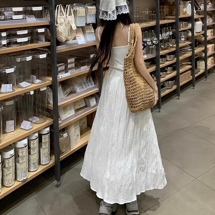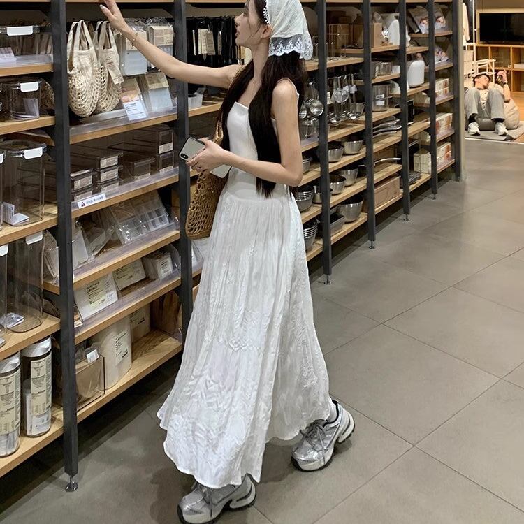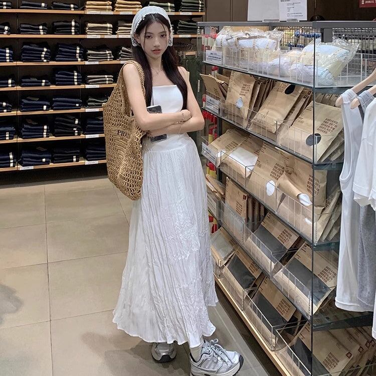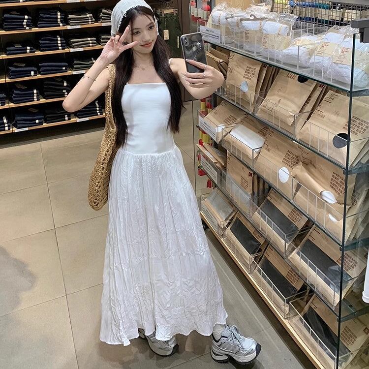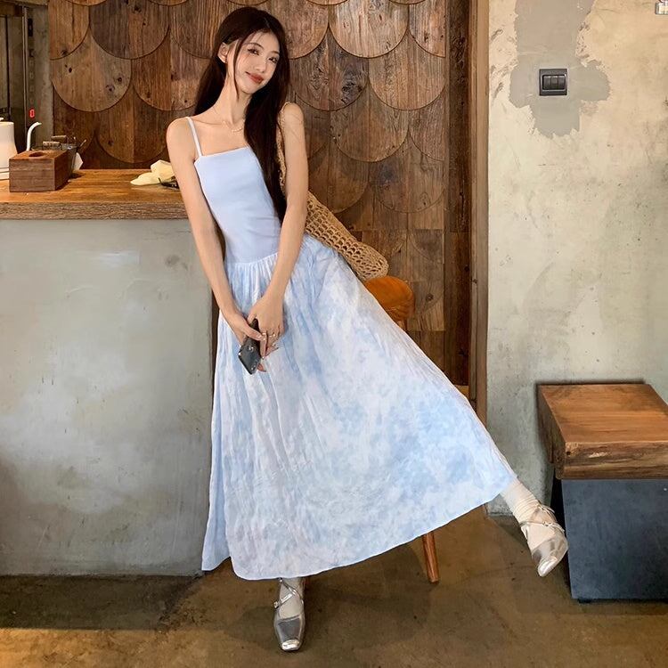 ワンピース レディース 韓国 ファッション キャミワンピ ノースリーブ 夏ワンピース ロングスカート 異素材ミックス フレア サマードレス
