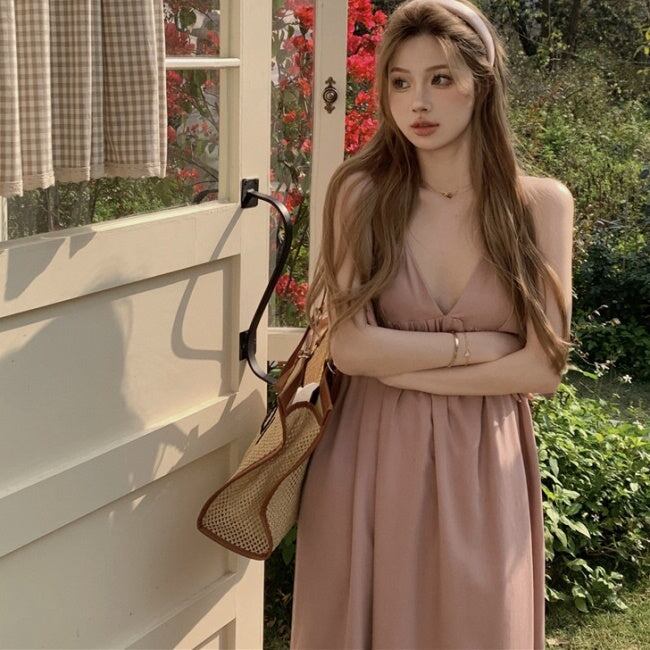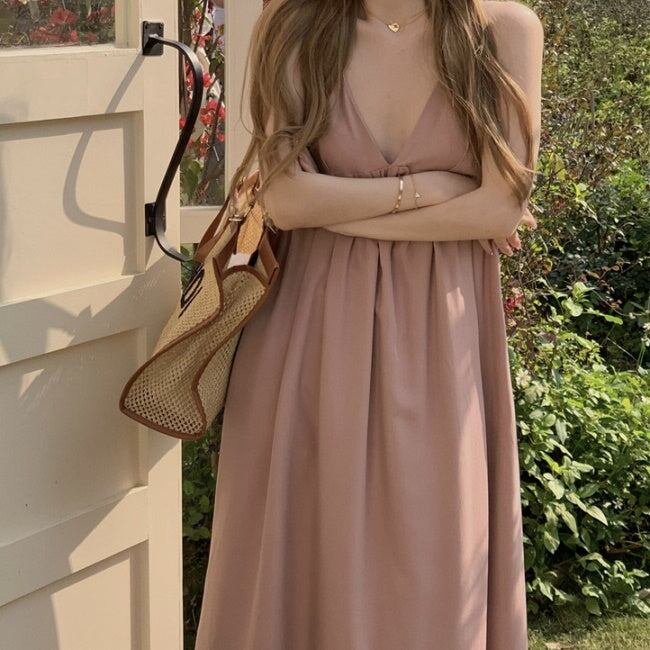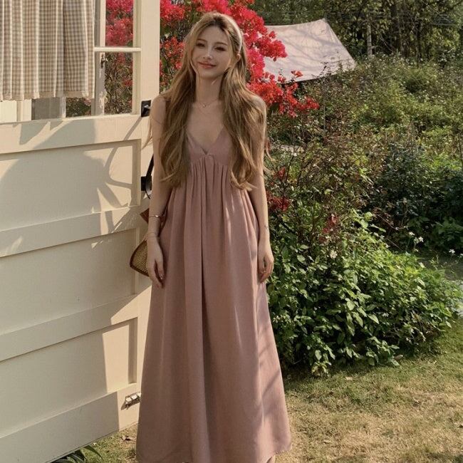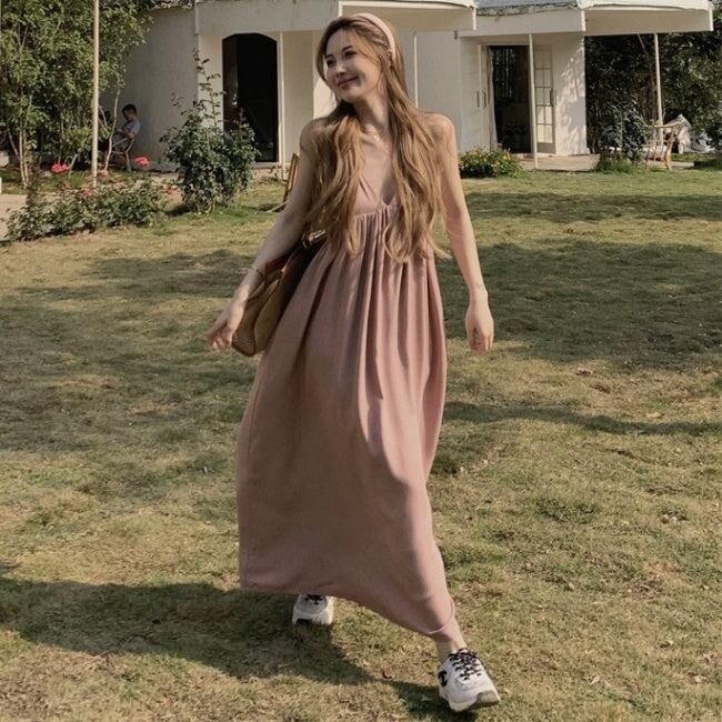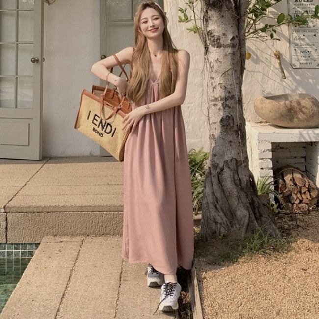 ワンピース キャミ ノースリーブ レディース 韓国 ファッション Aライン Vネック ボリューミー エアリー フレア ロングマキシ