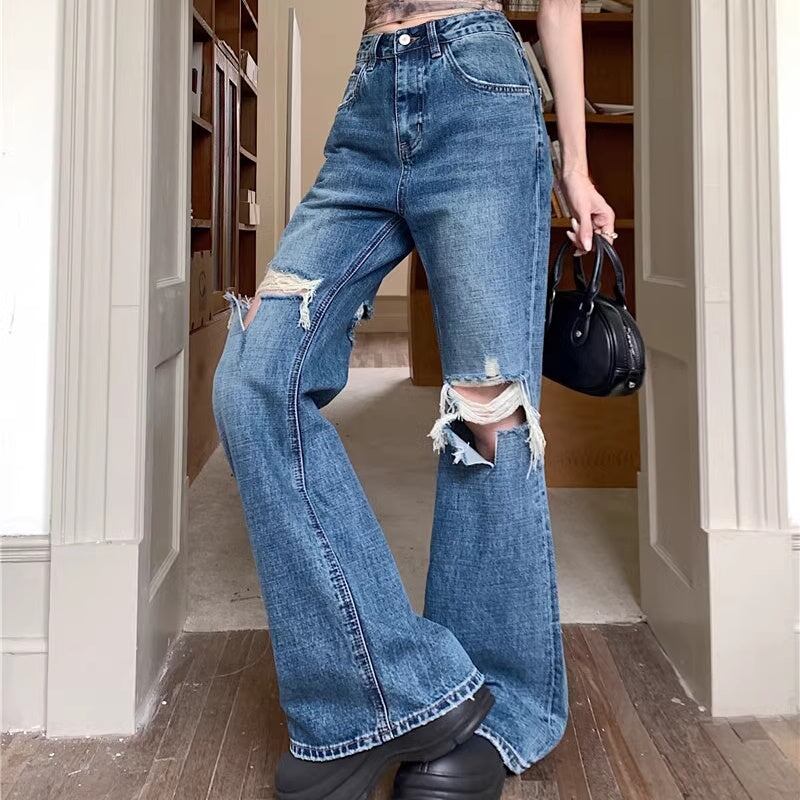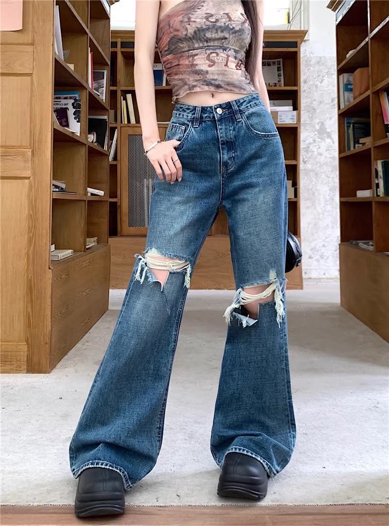 クラッシュ デニムパンツ レディース ダメージ加工 フレア ジーンズ 韓国 ファッション ストリート クラッシュ リップドジーンズ