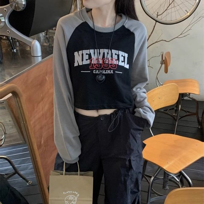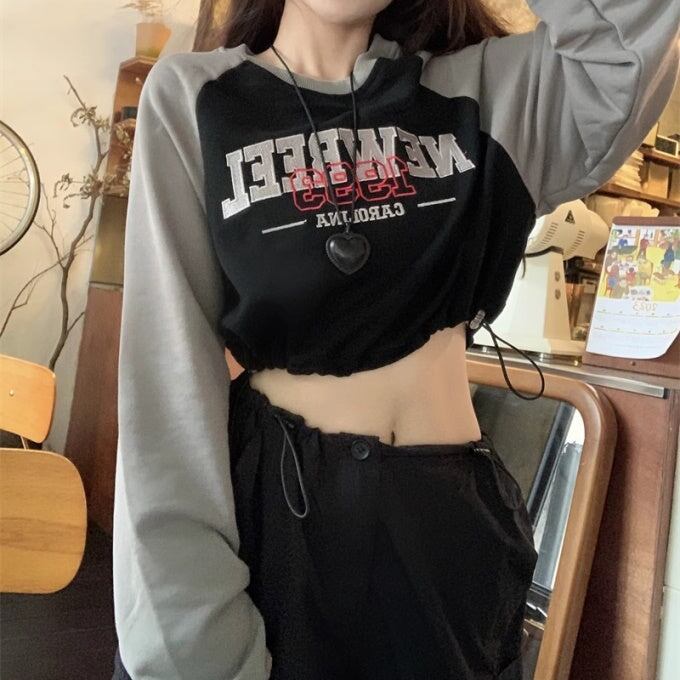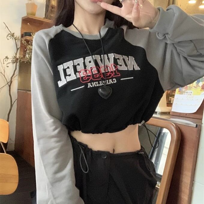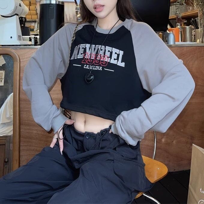 クロップ ラグラン トレーナー レディース 韓国 ファッション ロゴ グラフィック バイカラー ドローコード パラシュート スウェットトップス