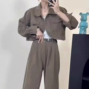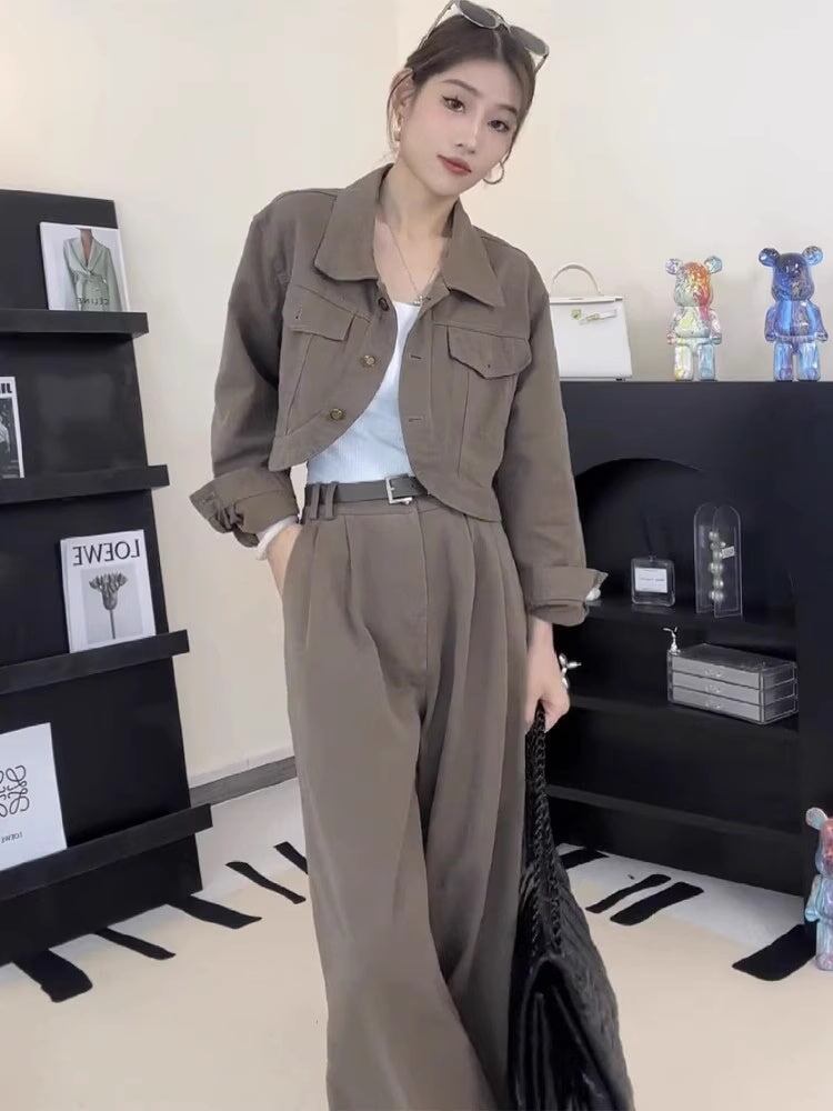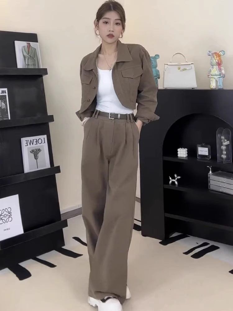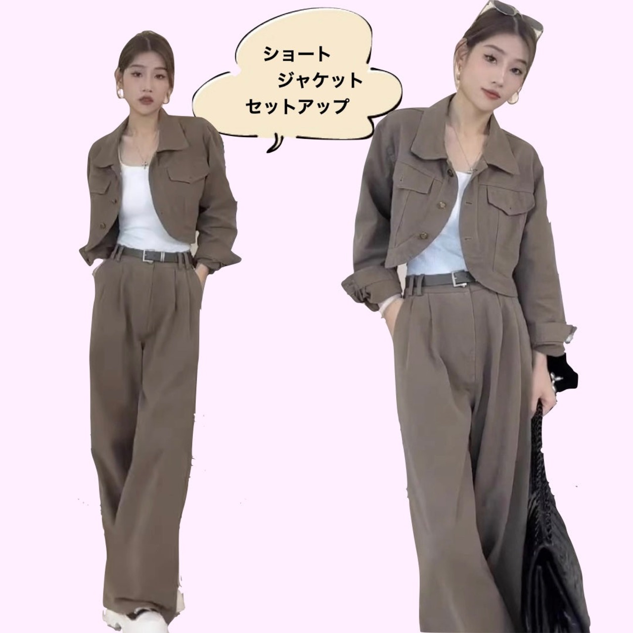 クロップジャケット セットアップ レディース 韓国 ファッション ロングパンツ ベルト付き シャツジャケット カジュアルスーツ 大人